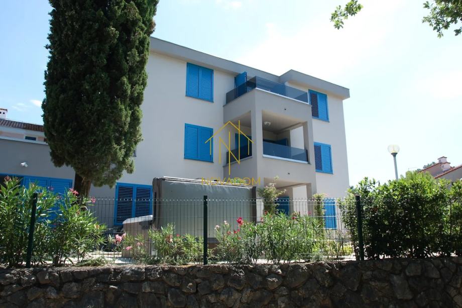 Krk,Malinska,prvi red do mora. Ekskluzivno u ponudi predstavljamo moderan te kompletno namješten i opremljen 3s apartman s pogledom na more i prekrasnom okućnicom i vrtom u prizemlju u izuzeto kvalitetnoj novogradnji. Nekretnina se sastoji od ulaznog prostora, open space koncepta dnevnog boravka s kuhinjom i pogledom na more, 2 prostrane spavaće sobe,kupaone s wc-om te natkrivene terase i vrta s jacuzziem. Nekretnini pripada i vanjsko parkirno mjesto.
