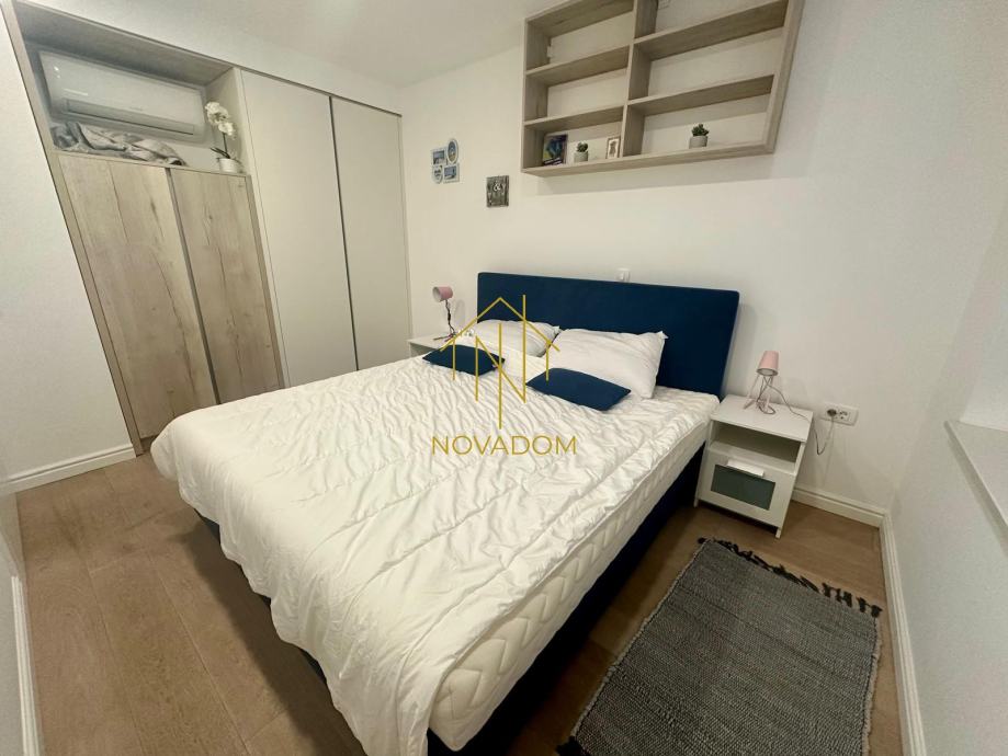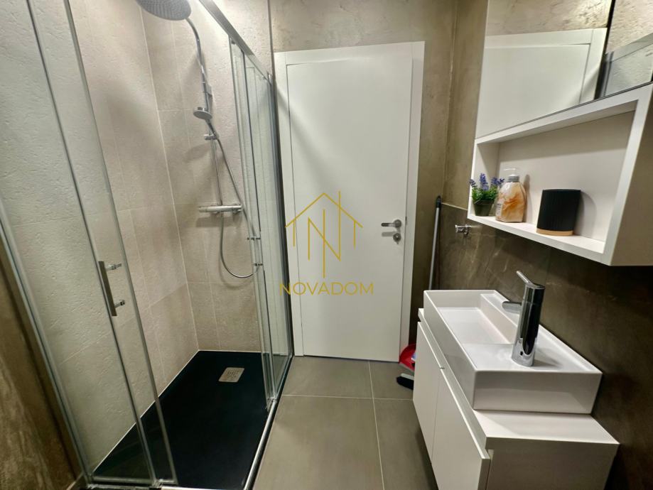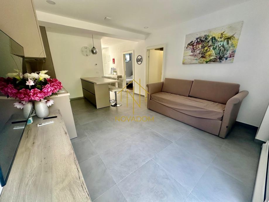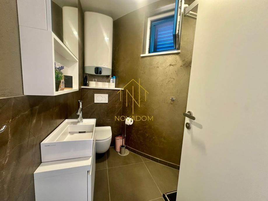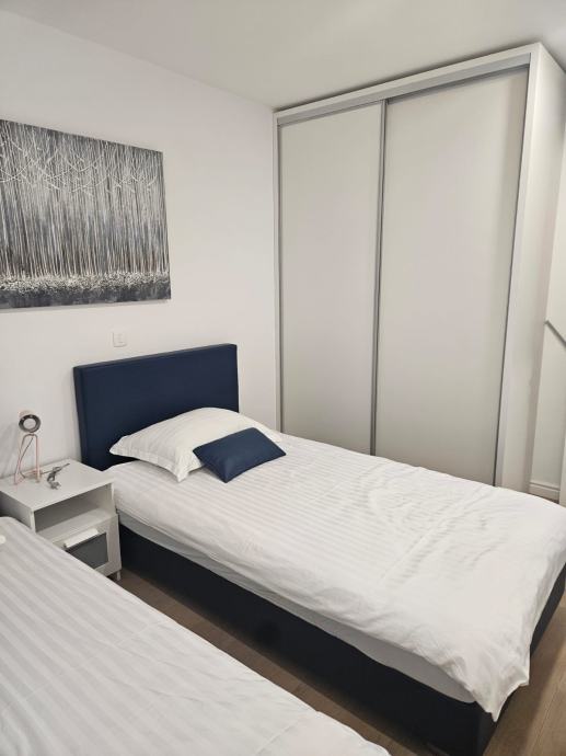 Krk, Malinska, first row to the sea. We exclusively offer a modern, fully furnished and equipped 3-room apartment with a beautiful garden and garden on the ground floor in the buuilding built in 2022.. The property consists of an entrance area, an open space concept living room with a kitchen and a view of the sea, 2 spacious bedrooms, a bathroom with a toilet and a terrace and garden with a jacuzzi. The property also has an outdoor parking space.