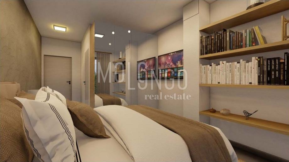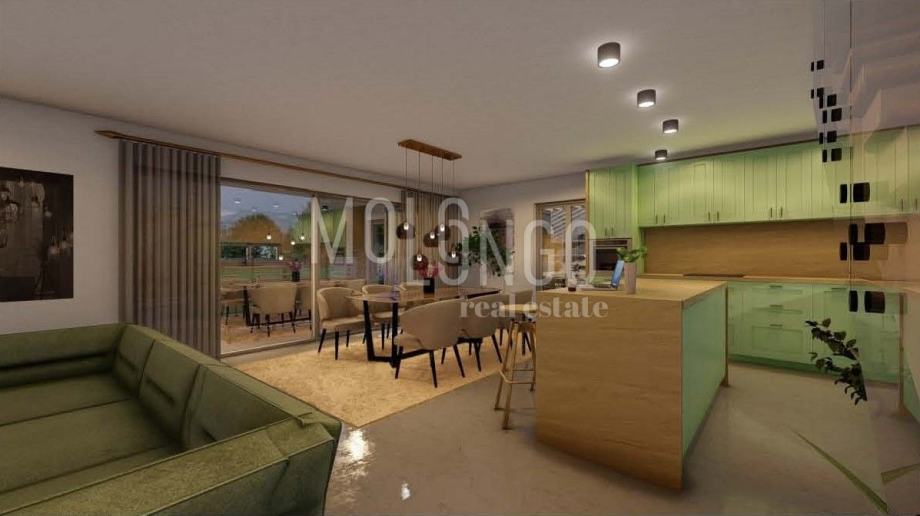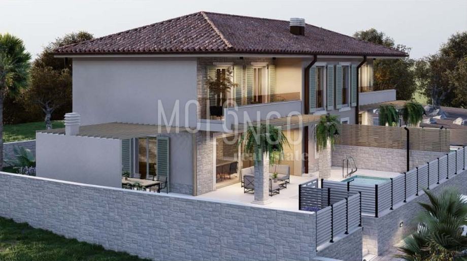 OTOK KRK, MALINSKA, prodajemo dvojnu kuću s bazenom površine 139,69 m2 i 173 m2 okućnice. Kuća je visine prizemlje i kat. Prizemlje se sastoji od ulaznog halla, open space kuhinje s blagovaonom i dnevnim boravkom iz kojeg se izlazi na djelomično natkrivenu terasu te u nastavku sunčalište i bazen površine 21 m2. U prizemlju je također i vešeraj i WC. Unutarnje stubište vodi na prvi kat gdje se nalaze tri spavaće sobe, tri kupaone i balkon na koji imaju pristup dvije sobe.