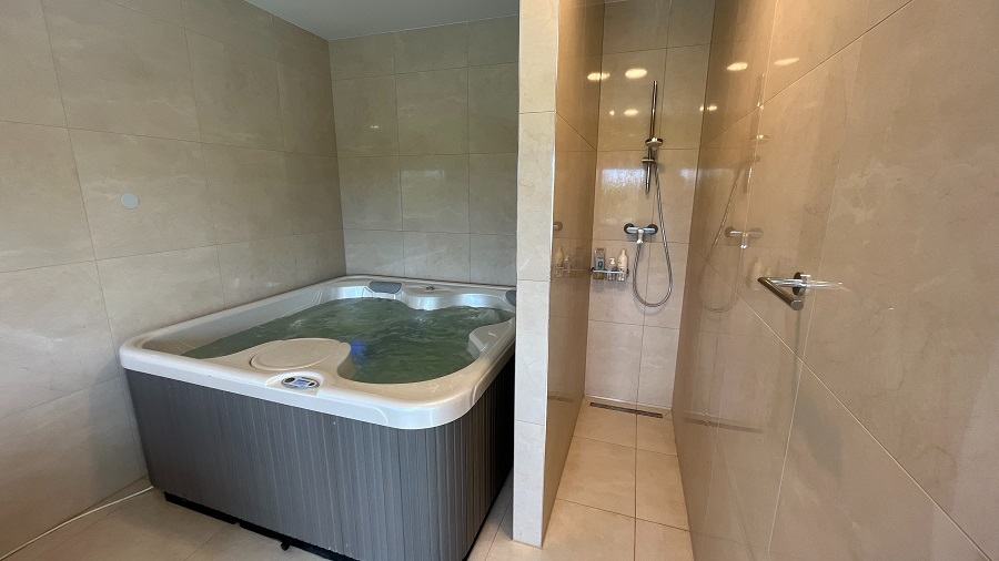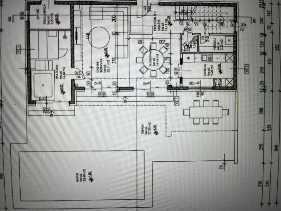 Prizemlje: spa zona ( jacuzzy i tuš)priprema za saunu, dnevni boravak, blagovaona, kuhinja, wc, spremište (vešeraj)