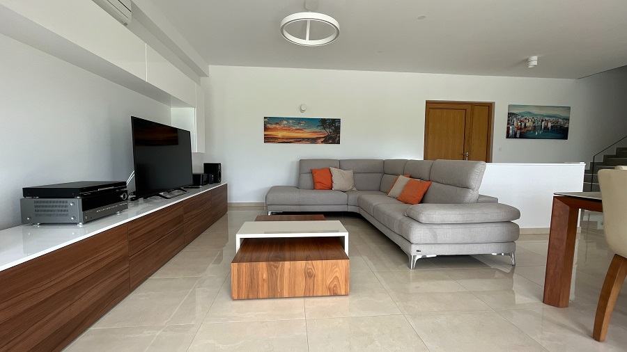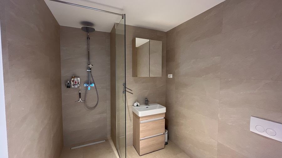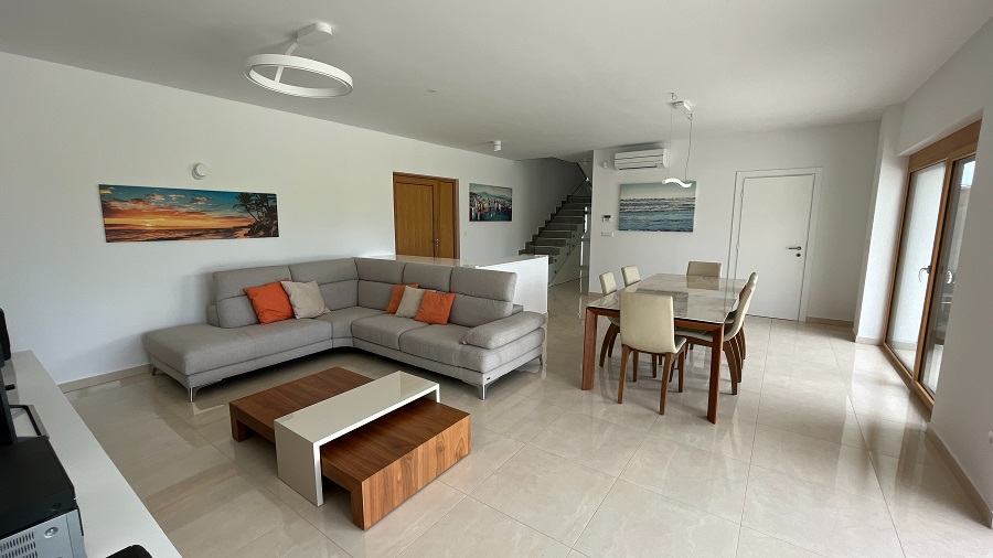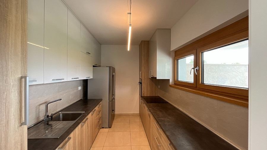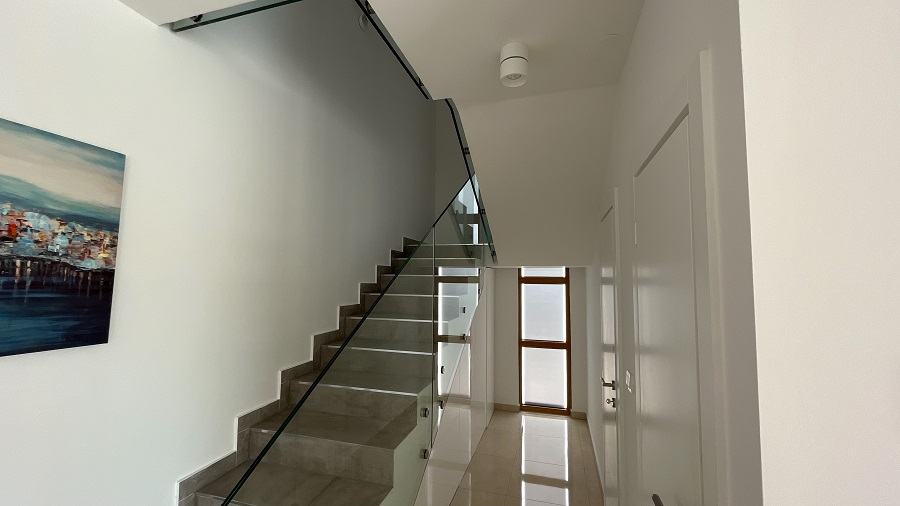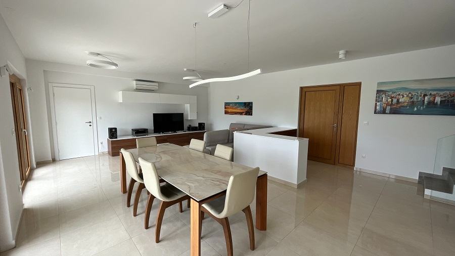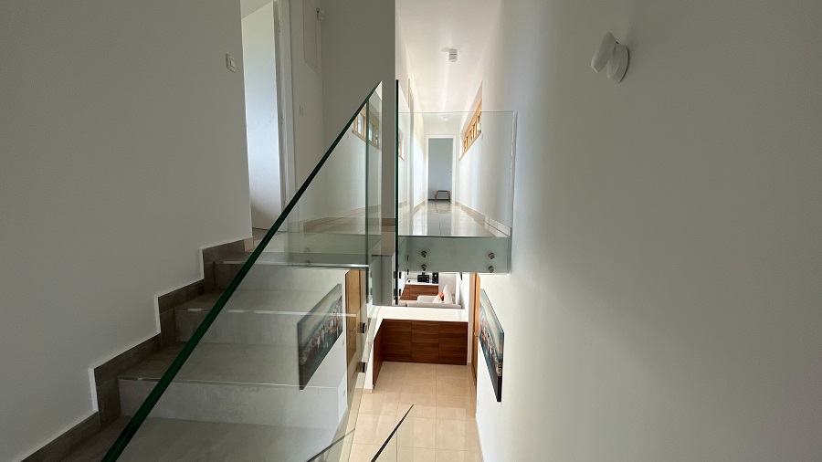 In the ground floor, the house offers an elegant living /dining room with separate kitchen. In front of the living room is the garden with a terrace and a 9m swimming pool providing more relaxed accommodation for the family. Next to the living room is a spa area (shower and Jacuzzi with a possibility of adding a sauna). On the side of the stairway leading up to the first floor is a small utility room for storage and washing machine.