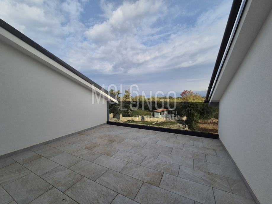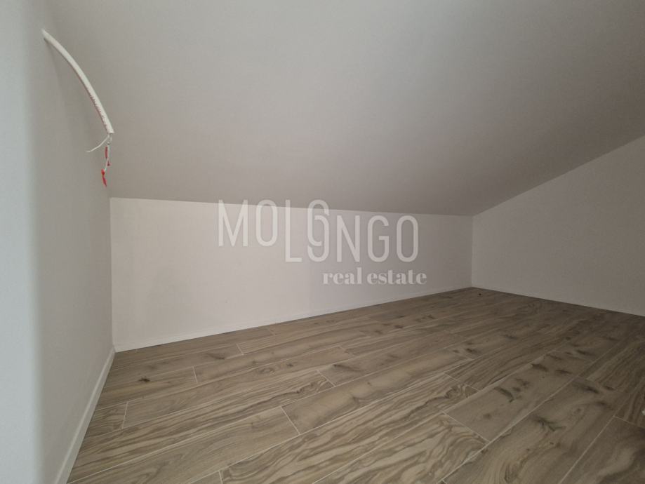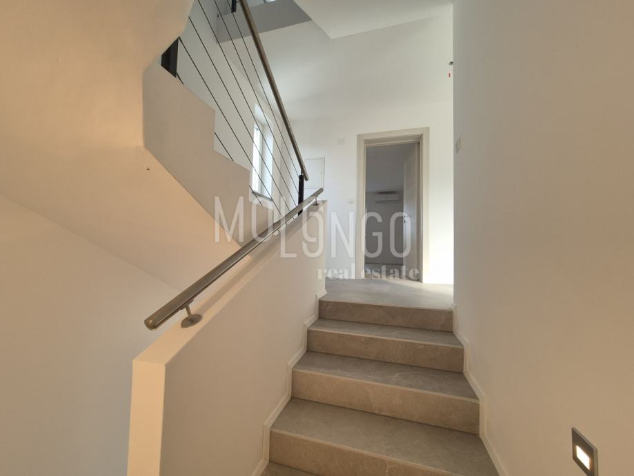 Ova novogradnja stambene površine 194 m2 podijeljena je u tri etaže. U prizemlju se nalaze kuhinja sa snevnim borvakom i blagovoanom, WC, kotlovnica te natkrivena terasa. Unutarnjim stubama dolazi se na kat koji se sastoji od tri spavaće sobe i tri kupaonice, te natkrivene terase s pogledom na more. U potkrovlju se nalazi hodnik, velika soba koju je moguće pregraditi u dvije sobe, dva spremišta, kupaona te krovna terasa s prekrasnim pogledom na more. Kući pripada i prostrana okućnica od 565 m2 koja će biti uređena sadnjom mediteranskog raslinja i koja ima dovoljno prostora za parkirna mjesta, ali i za izgradnju bazena i sunčališta.