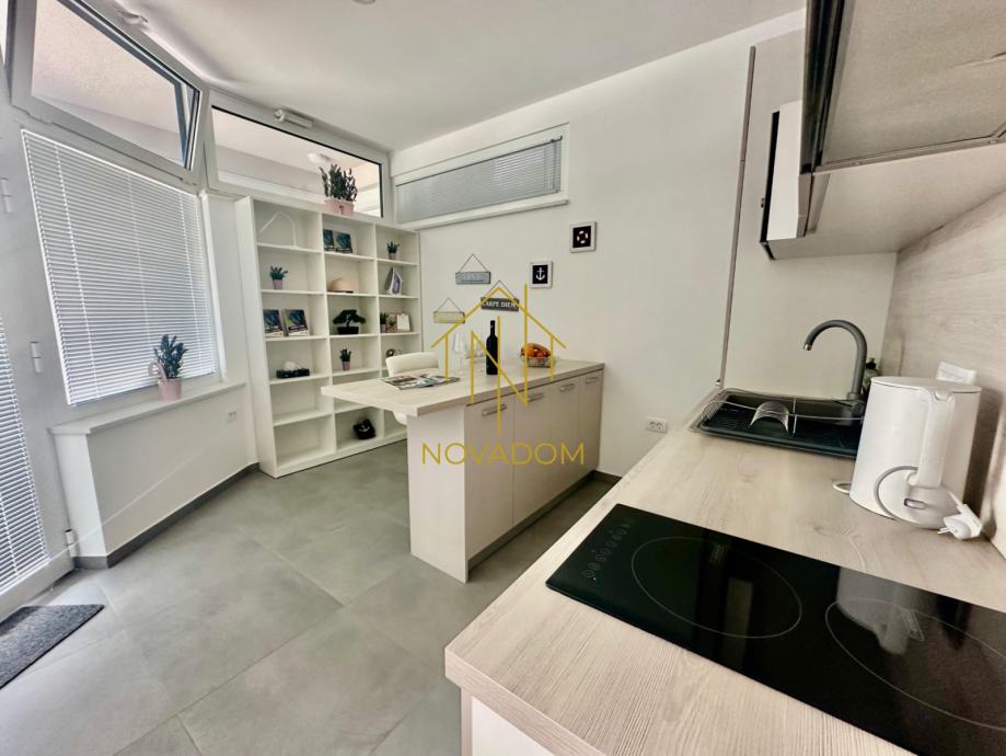 Krk,Malinska,prvi red do mora. Ekskluzivno u ponudi predstavljamo moderan te kompletno namješten i opremljen studio apartman (upisan kao poslovni prostor) s natkrivenom terasom u prizemlju. Nekretnina se sastoji od ulaznog prostora, open space koncepta dnevnog boravka s kuhinjom i blagovaonom,kupaone s wc-om te natkrivene terase. Nekretnini pripada i vanjsko parkirno mjesto.
