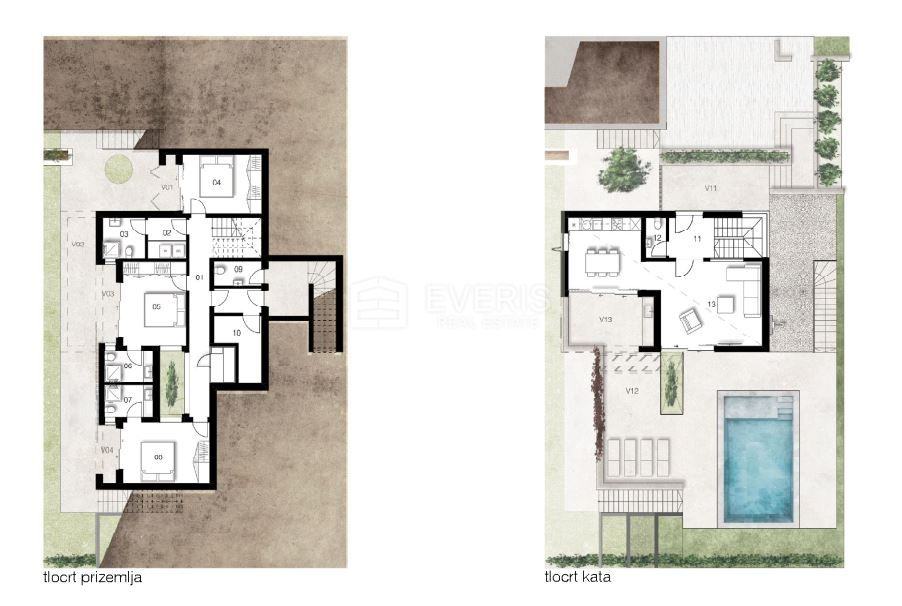 ▪ PRIZEMLJE: hodnik, vanjski WC, strojarnica i praonica, spa, spavaća soba, tri kupaonice, spavaća soba, playroom