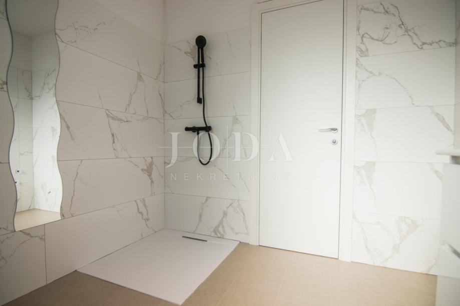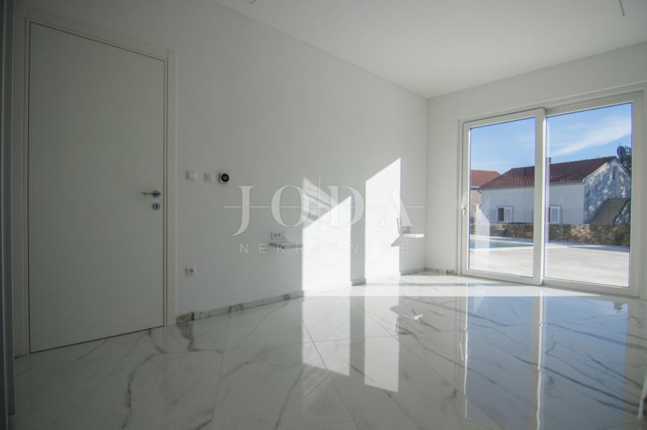 U prizemlju se nalazi ulazno predsoblje iz kojeg se pristupa spavaćoj sobi te prostranom dnevnom dijelu otvorenog koncepta. Taj prostor objedinjuje kuhinju, blagovaonicu i dnevni boravak s izlazom na terasu s bazenom, čime se postiže skladan spoj interijera i eksterijera.U prizemlju su također smješteni vešeraj i gostinjski WC, diskretno odvojeni radi dodatne praktičnosti i funkcionalnosti prostora.Kuhinja je izrađena po mjeri, kao i ostatak namještaja, u potpunosti prilagođen specifičnom tlocrtu kuće, čime se postiže maksimalna iskoristivost prostora te sklad funkcionalnosti i estetike.