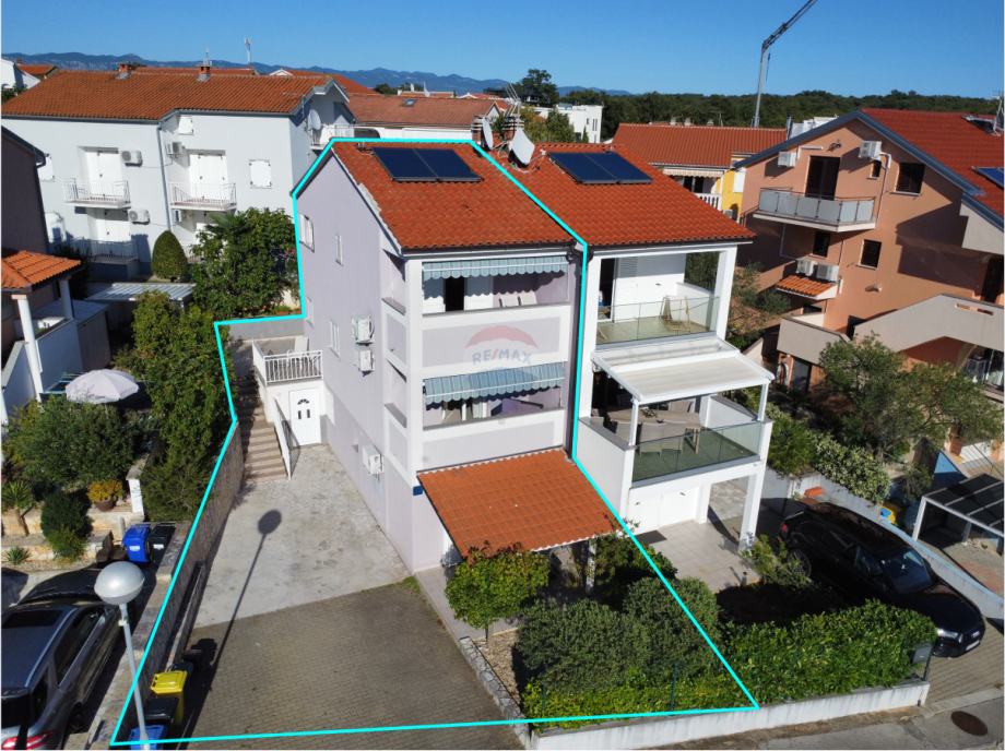 Kuća ima tri privatna parkirna mjesta, što je izuzetno korisno u ljetnim mjesecima. Tu je i prostrana kotlovnica/spremište u prizemlju, s velikim bojlerom povezanima na solarne panele, koji opskrbljuju toplom vodom cijeli objekt – energetski učinkovito i ekološki prihvatljivo rješenje.