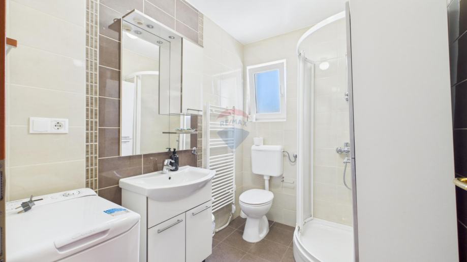 Kuća se sastoji od dva stana. U prizemlju se nalazi stan površine 40 m² koji uključuje dnevni boravak s kuhinjom i blagovaonicom, spavaću sobu, kupaonicu te natkrivenu terasu s izlazom na zeleni pojas – idealan prostor za uživanje u miru i prirodi.