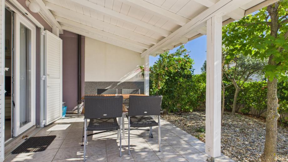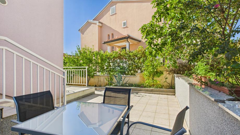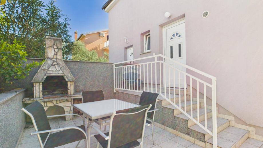 U dvorištu se nalazi intimna terasa s roštiljem, zaklonjena zelenim pojasom, idealna za druženja i ljetne večeri. Cijeli vanjski prostor pažljivo je uređen kako bi osigurao privatnost i udobnost.