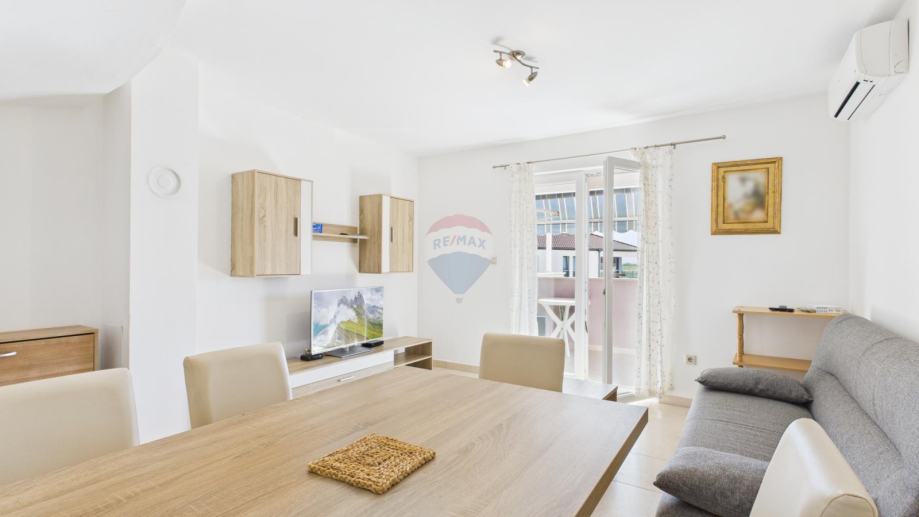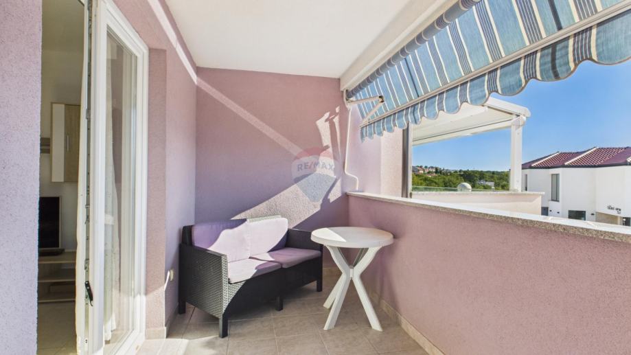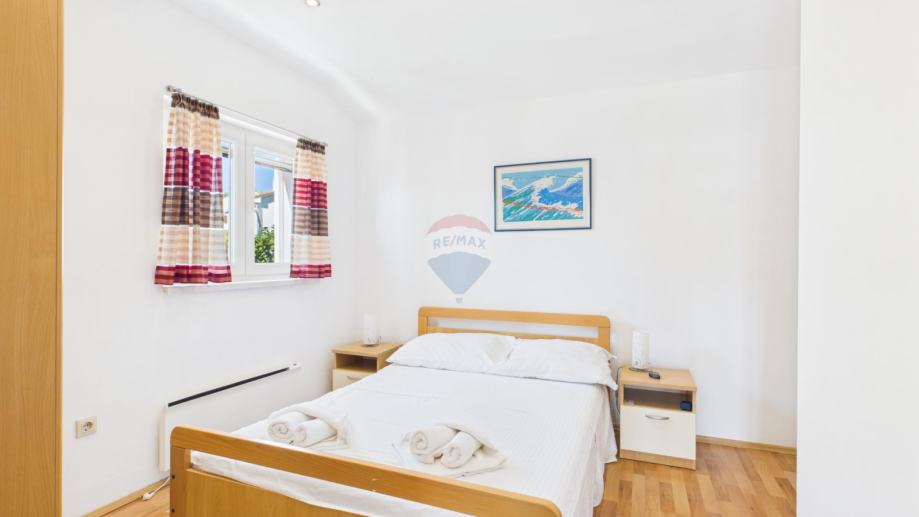 Vanjsko stubište vodi do dvoetažnog stana površine 80 m². Na prvoj etaži nalazi se dnevni boravak s kuhinjom i blagovaonicom, toalet te terasa s koje se pruža otvoren i neometan pogled na more – savršeno mjesto za jutarnju kavu ili opuštanje uz zalazak sunca.