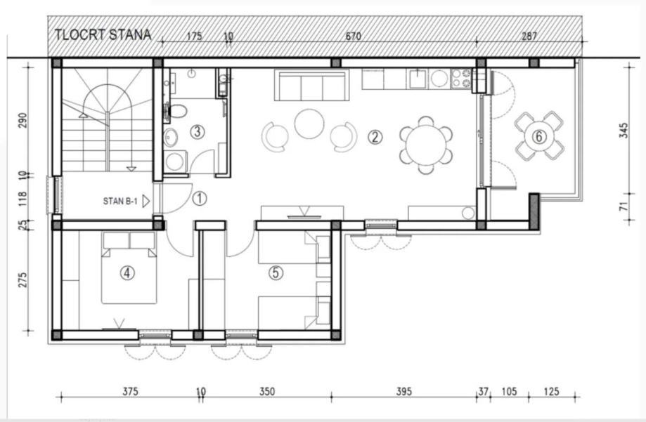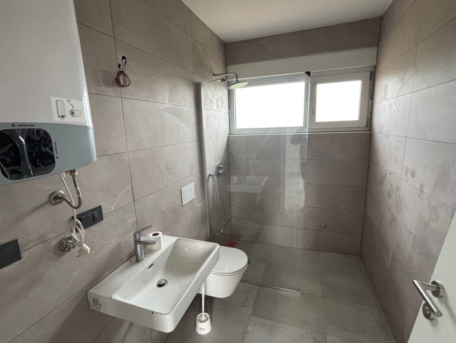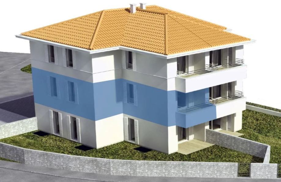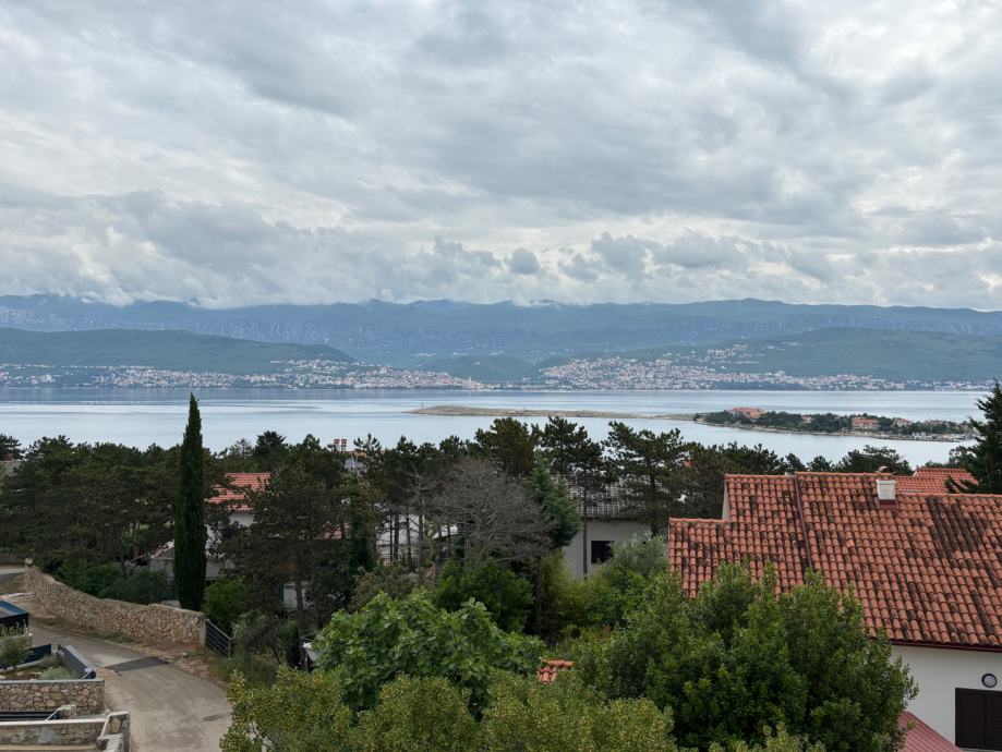 Otok Krk, urbana villa, novogradnja, trosoban apartman - stan na I katu 68 m2 + spremište + parkirno mjesto. Sastoji se od: dnevnog boravka, blagovaone i kuhinje 25 m2, kupaona 5 m2, spavaće sobe 10 i 12 m2 te balkona 8 m2. Do plaže je 300 metara. U prizemlju se prodaje isti trosoban stan (apartman) sa 138 m2 vrta.