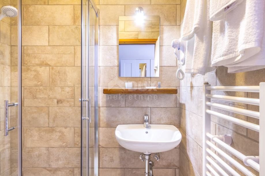 Poslovno- stambeni objekt s oko 570 m2 na izvrsnoj lokaciji smješten na parceli od oko 1500 m2. Objekt ima četiri etaže. U suterenu se nalazi kotlovnica i prostrano spremište. U prizemlju objekta nalazi se kompletno uređen restoran s profesionalnom kuhinjom, osamdeset sjedećih mjesta te izlazom na vanjsku terasu. Unutrašnje stepenice vode na prvi i drugi kat gdje se nalazi dvanaest vrlo lijepo opremljenih dvokrevetnih spavaćih soba svaka sa kupaonicom i izlazom na balkon s kojeg se pruža pogled na more. Na uređenoj okućnici od nalazi se sunčalište sa jacuzzijem, okruženo mediteranskim biljem i maslinama. Tu je također smješteno igralište za djecu te parkirni prostor. Pri gradnji i adaptaciji koja je obavljena 2016. godine korišteni su vrlo kvalitetni materijali i oprema, visokokvalitetna keramika, PVC stolarija, vrhunske sanitarije, TV, klima uređaji, voda se grije preko solarnih panela