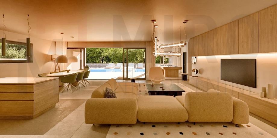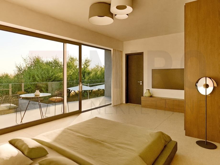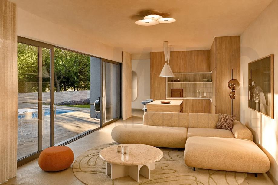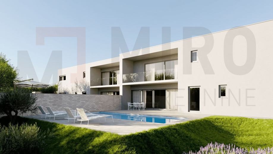 Otok Krk, šira okolica grada Krka, prodaja moderne dvonje kuće s bazenom i pogledom na more. Ukupna stambena površina nekretnine je 160 m2, sastoji se od prizemlja i prvog kata, međusobno povezanih unutarnjim stepeništem. Prvi kat ima površinu od 78 m2, a sastoji se od hodnika, i tri spavaće sobe, svaka sa svojom kupaonicom od kojih jedna ima izlaz na loggiu. Prizemlje, površine 80 m2, sastoji se od ulaznog prostora, spavaće sobe s kupaonicom, vešeraja, saune s tušem te open space kuhinje s blagovaonom i dnevnim boravkom s izlazom na loggiu i okućnicu na kojoj se nalazi bazen sa sunčalištem i roštilj. Na predmetnoj okućnici imaju 2 parkirna mjesta.