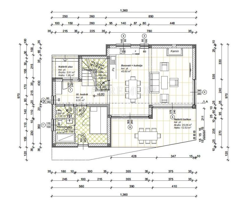 U prizemlju nalazi se ulazna terasa, hodnik, stubište, kupaonica, wc, sauna, kuhinja s blagovaonom i dnevnim boravkom, s izlazom na natkrivenu terasu (25 m2).