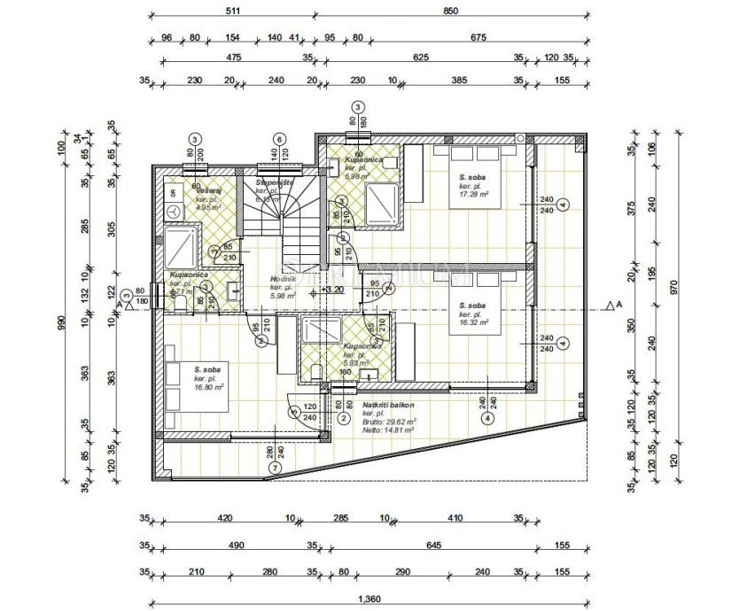 Na prvom katu bit će hodnik, vešeraj, tri spavaće sobe, svaka sa svojom kupaonicom, i s izlazima na natkrivenu terasu s koje će se pružati otvoreni, panoramski pogled na more.