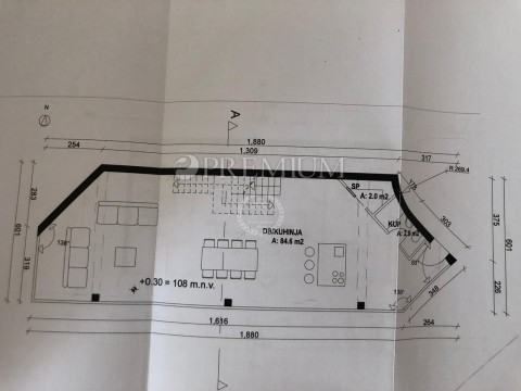 Unutarnjim stepeništem dolazi se u prizemlje, gdje se nalazi spremište, gostinjski wc, te open space prostor koji obuhvaća kuhinju s blagovaonom i dnevnim boravkom, s izlazom na okućnicu.
