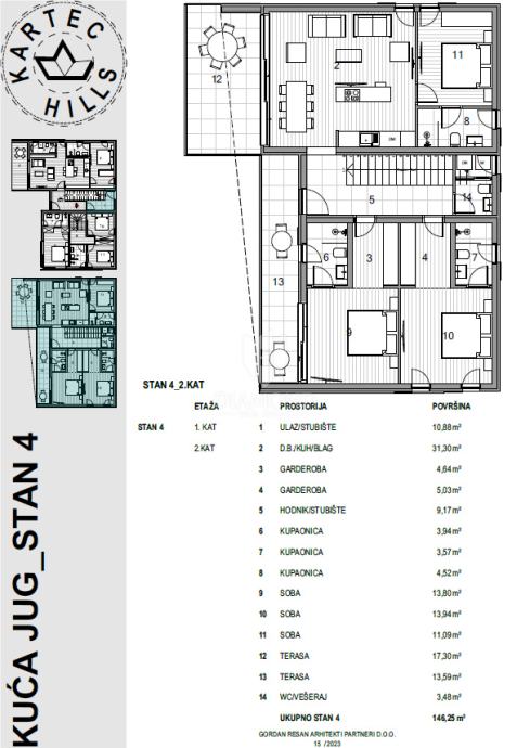 Penthouse je dizajniran s pažnjom na svaki detalj. Prostire se na prostranom tlocrtu koji uključuje kuhinju s blagovaonicom i dnevnim boravkom u open space konceptu, stvarajući prostran i svijetao prostor idealan za druženja i opuštanje. Dnevni boravci i spavaće sobe imaju jugozapadnu orijentaciju, osiguravajući obilje prirodne svjetlosti i prekrasne zalaske sunca. Tri spavaće sobe dolaze s pripadajućim kupaonicama, pružajući maksimalnu privatnost i udobnost. Iz svake sobe se pruža pristup na terasu, savršenu za uživanje u svježem zraku i panoramskim pogledima.