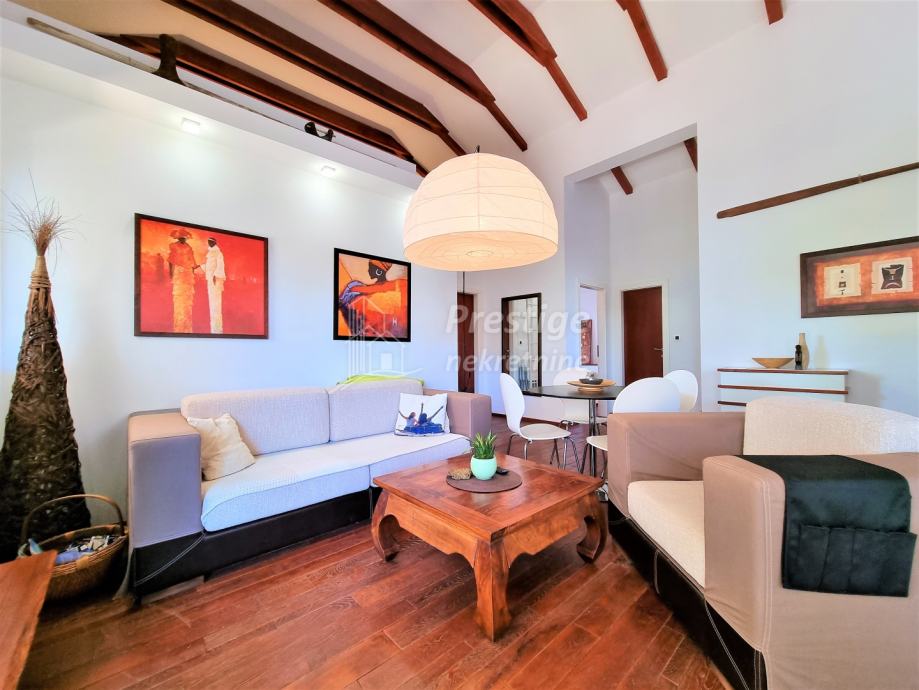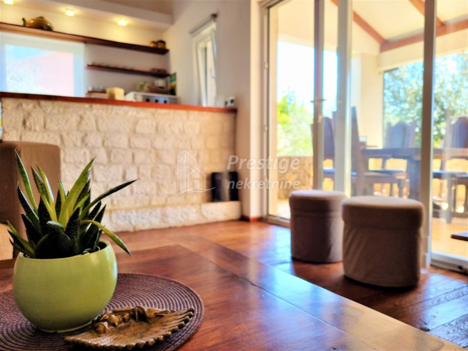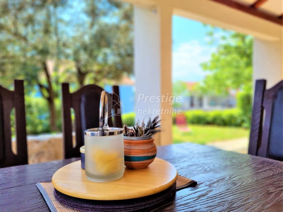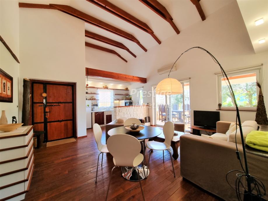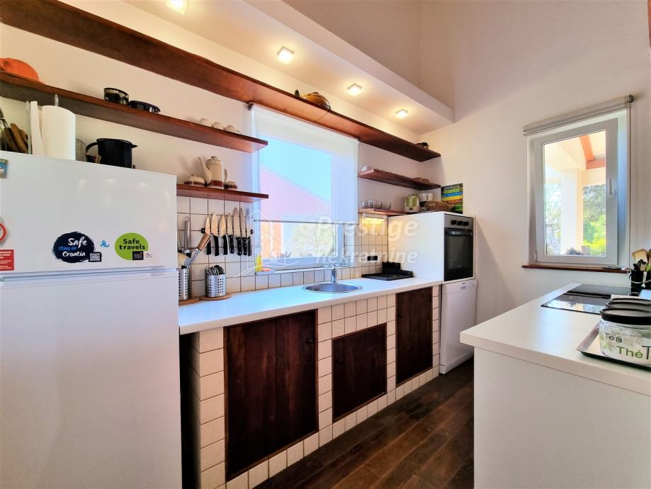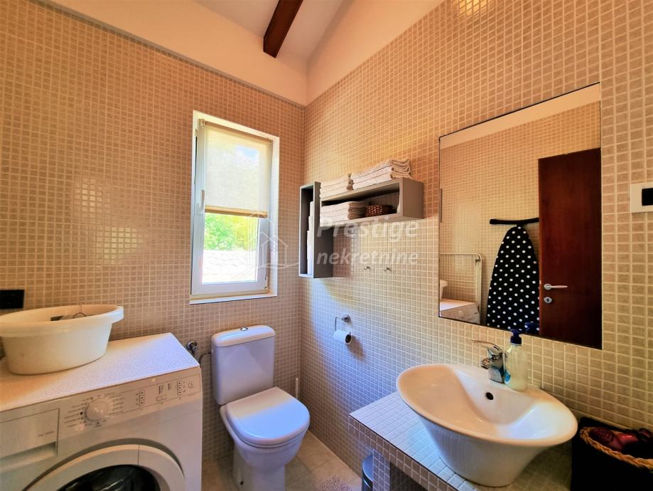 Na prodaju je prekrasno uređena kuća u mjestu Pinezići na otoku Krku, na lijepoj, mirnoj lokaciji udaljenoj svega osamsto metara od mora. Kuća se prostire na 100 m2 u prizemlju s dodatnih 25 m2 u podrumu te čak 27m2 natkrivene terase. Sastoji se od velikog dnevnog boravka s visokim stropom, a u sklopu kojega je i kuhinja i blagovaonica te galerija. Sve tri spavaće sobe imaju ugrađene ormare čija klizna vrata služe i kao sjenila za prozore. Kupaonica je prostrana, kompletno opremljena, a tu je i dodatni toalet. Iznad jedne od spavaćih soba je lijepa, prostrana galerija na kojoj su dodatna mjesta za spavanje, a po potrebi se može urediti i drugačije. Iz boravka se izlazi na natkrivenu terasu koja se prostire čitavom duljinom kuće, a na terasi su po narudžbi rađeni masivni drveni stol i stolice te fantastično osmišljeni lounge dio s mekanim jastucima i masivnim stolićem. S terase se izlazi na lijepo dvorište u kojem je i veliki roštilj, ali i više nego dovoljno mjesta za ugraditi prostrani bazen. Čitava okućnica je u zelenilu koje diskretno odjeljuje kuću od pogleda susjeda, a ispred kuće su i zelenilom natkrivena dva parkirna mjesta, a po potrebi moguće je parkirati i dodatna vozila u dvorištu. Do mora je cca 800m, svega tri minute vožnje autom ili par minuta više laganog hoda. Na izbor je više plaža i uvala za kupanje s puno hladovine, ali i sadržaja tipa restorana i barova. Sam otok Krk je jedna od najtraženijih lokacija na Jadranu, sva mjesta na otoku su izvrsno prometno povezana, kao i sam otok s kopnom. Kuća je građena 2004.g. vrhunskim materijalima, a prodaje se kompletno namještena i opremljena. Nisu potrebna baš nikakva dodatna ulaganja, kuća je izrazito dobro održavana, vlasništvo je uredno.