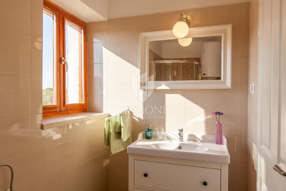Okućnica je pažljivo uređena i nudi obilje zelenih površina s ukrasnim biljem, maslinama, smokvama i kaki stablima. Savršeno mjesto za uživanje na otvorenom pruža i privatni bazen koji je smješten kako bi pružio maksimalnu udobnost.