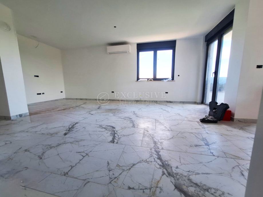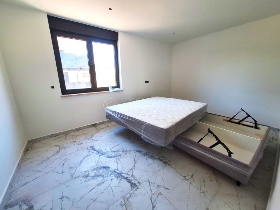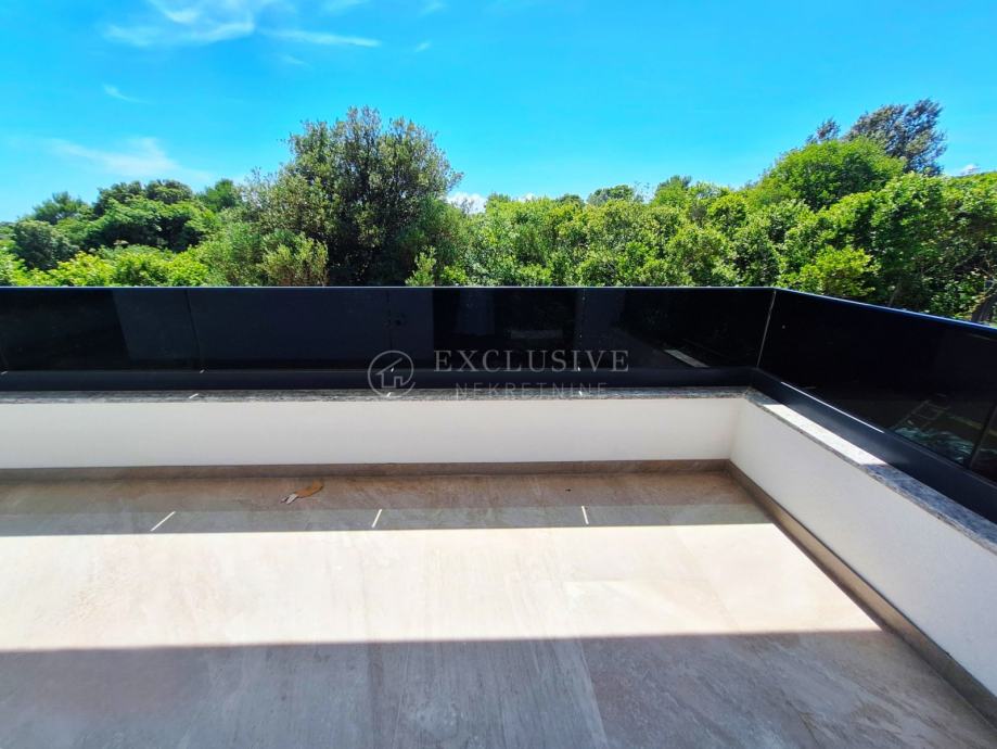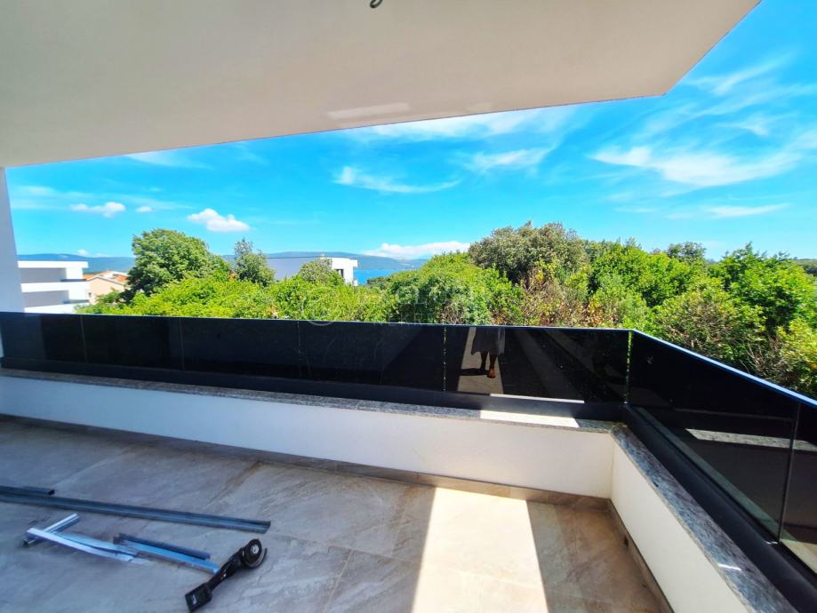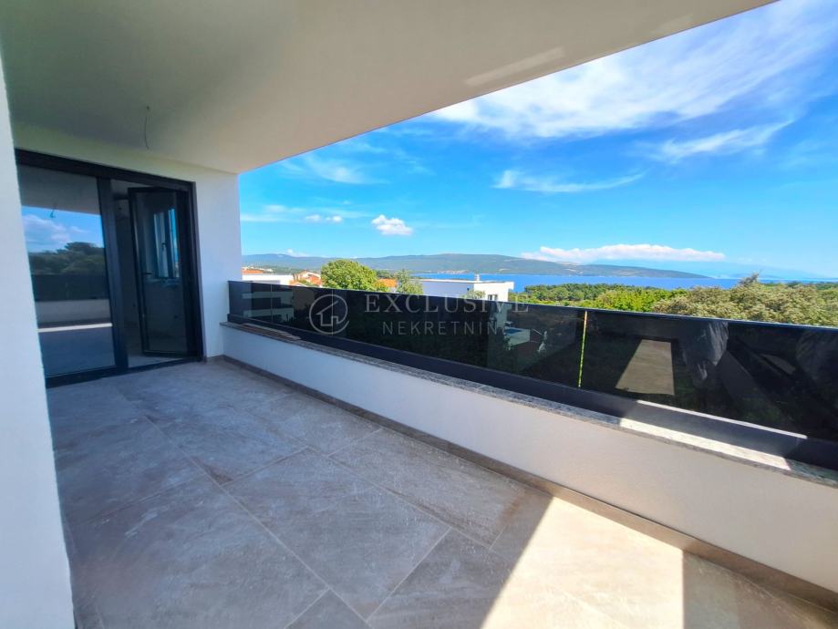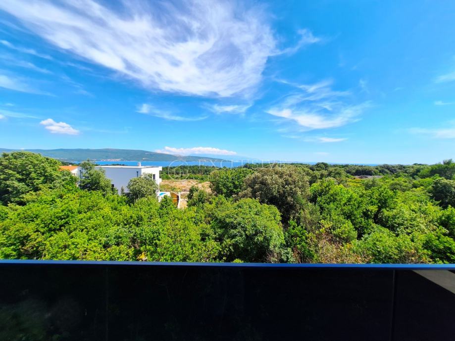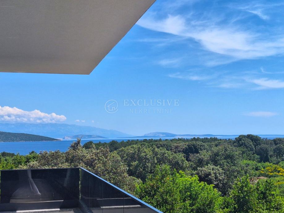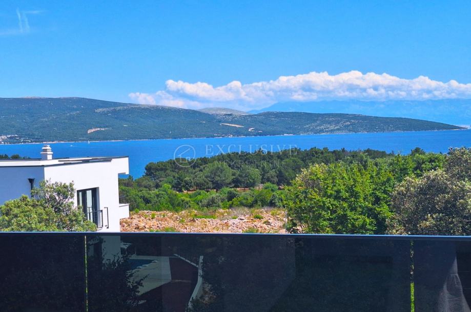 U gradu Krku smjestio se prekrasan luksuzni dvoetažni apartman s otvorenim pogledom na more. Apartman stambene površine 168 m2 nalazi se u novoizgrađenom objektu s ukupno 4 stambene jedinice. Apartman je razveden na dvije etaže, a na prvoj etaži nalaze se tri spavaće sobe od kojih je jedna master soba s vlastitom kupaonicom i garderobom te još jedna kupaonica. Unutarnjim stepeništem se uspinjemo na drugu etažu na kojoj se nalazi kuhinja, blagovaonica, dnevni boravak te spavaća soba s kupaonicom. Sa prostranih terasa koje se pružaju na obje etaže očaravati će prekrasan otvoreni pogled na more. Apartman je opremljen visokokvalitetnim materijalima, troslojnom aluminijskom vanjskom stolarijom s električnim podizačima roleta i komarnicima te podnim grijanjem. Apartmanu pripadaju dva parking mjesta i spremište.