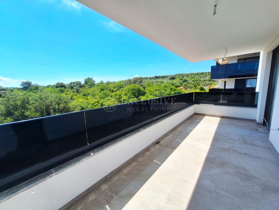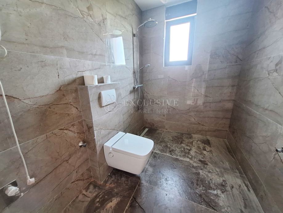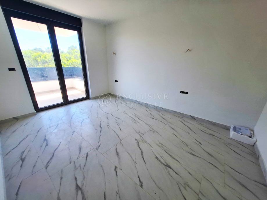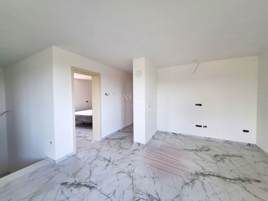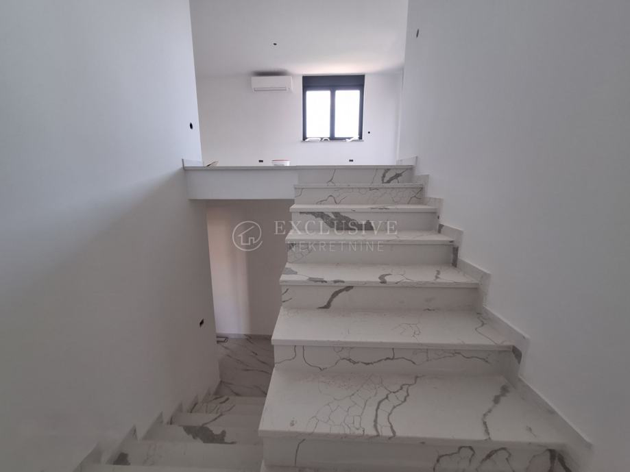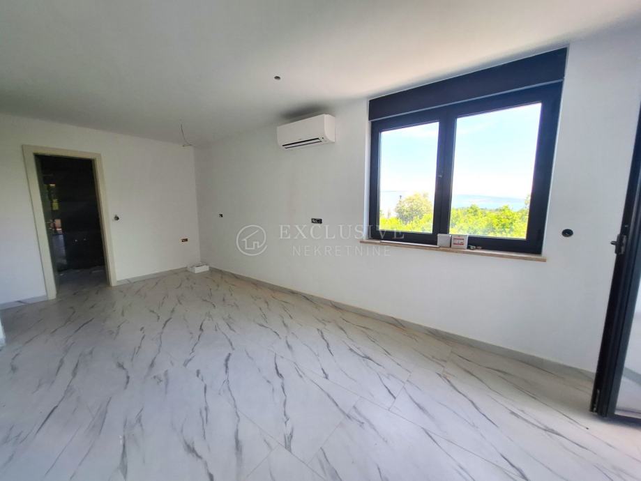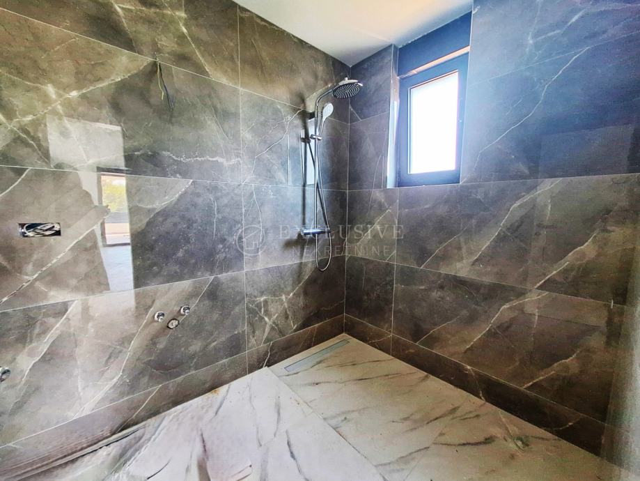 U gradu Krku smjestio se prekrasan luksuzni dvoetažni apartman s otvorenim pogledom na more. Apartman stambene površine 168 m2 nalazi se u novoizgrađenom objektu s ukupno 4 stambene jedinice. Apartman je razveden na dvije etaže, a na prvoj etaži nalaze se tri spavaće sobe od kojih je jedna master soba s vlastitom kupaonicom i garderobom te još jedna kupaonica. Unutarnjim stepeništem se uspinjemo na drugu etažu na kojoj se nalazi kuhinja, blagovaonica, dnevni boravak te spavaća soba s kupaonicom. Sa prostranih terasa koje se pružaju na obje etaže očaravati će prekrasan otvoreni pogled na more. Apartman je opremljen visokokvalitetnim materijalima, troslojnom aluminijskom vanjskom stolarijom s električnim podizačima roleta i komarnicima te podnim grijanjem. Apartmanu pripadaju dva parking mjesta i spremište.