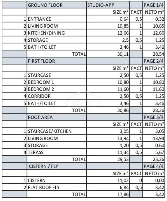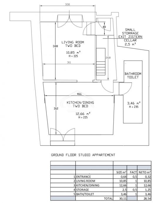 Ukupne površine od oko 80 m², kuća se prostire na više etaža. U prizemlju se nalazi garsonijera s dnevnim boravkom, kuhinjom s blagovaonicom, dodatnim prostorom za spavanje te kupaonicom s toaletom. Iz kuhinje se pruža pristup spremištu u podrumu.