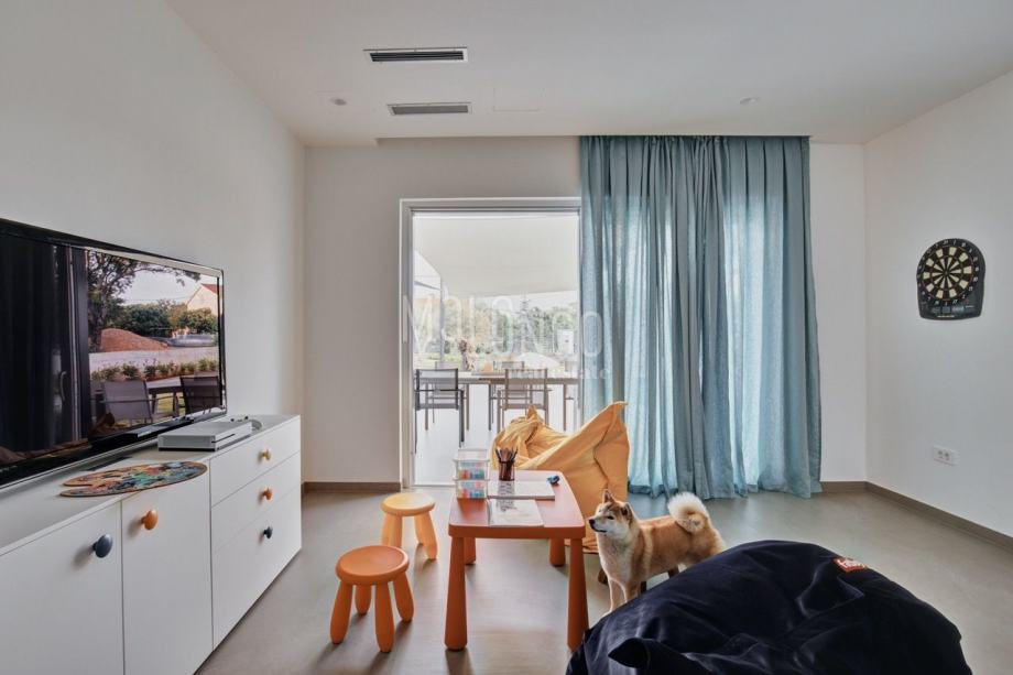 U prizemlju kuće se nalazi ogroman dnevni boravak sa kuhinjom, od dvorišta odvojen velikim staklenim stijenama. Na istoj etaži nalazi se i igraonica, wellness zona te dodatni toalet. Iz dnevnog dijela kuće se izlazi na vanjsku terasu južne orijentacije gdje se nalazi i bazen.