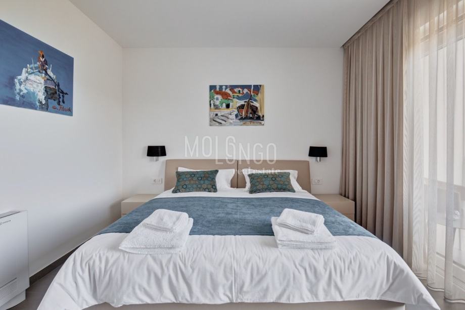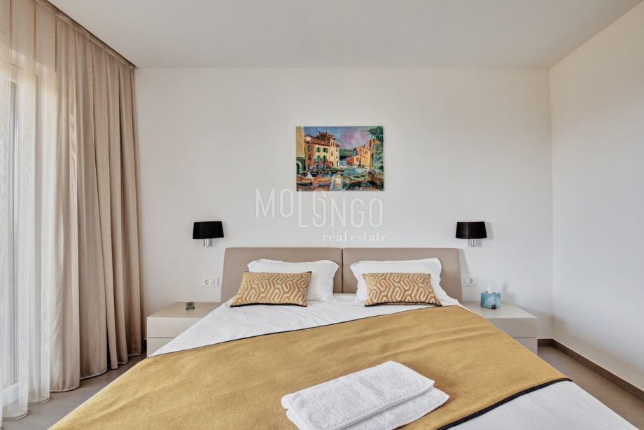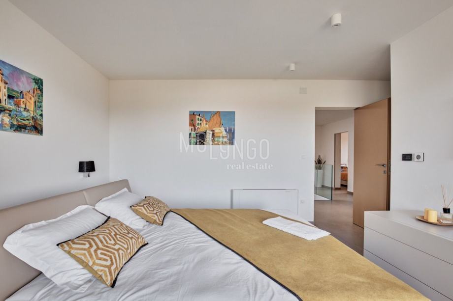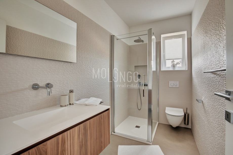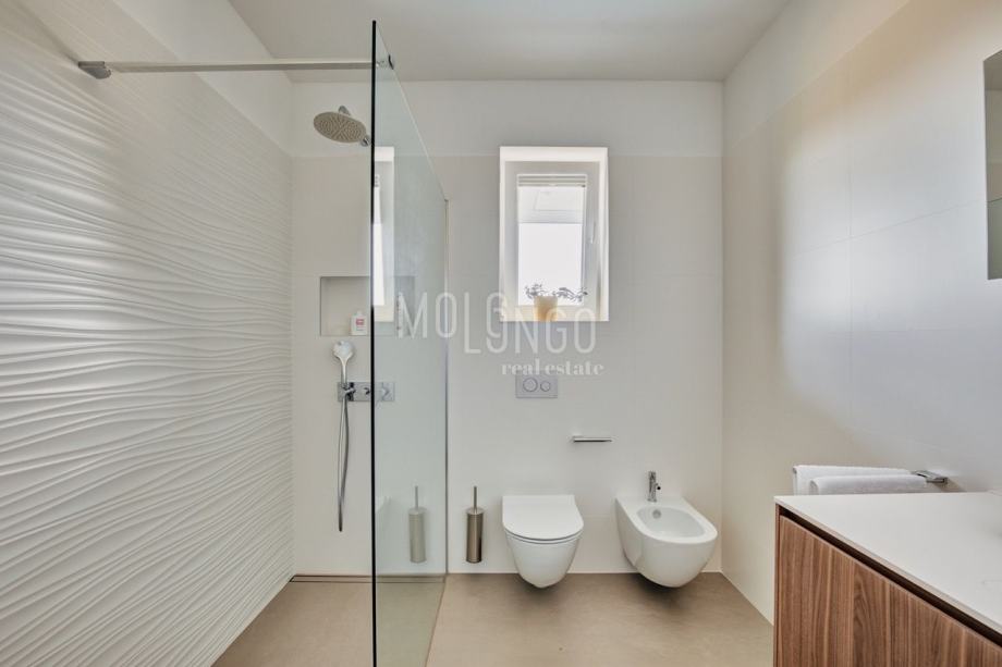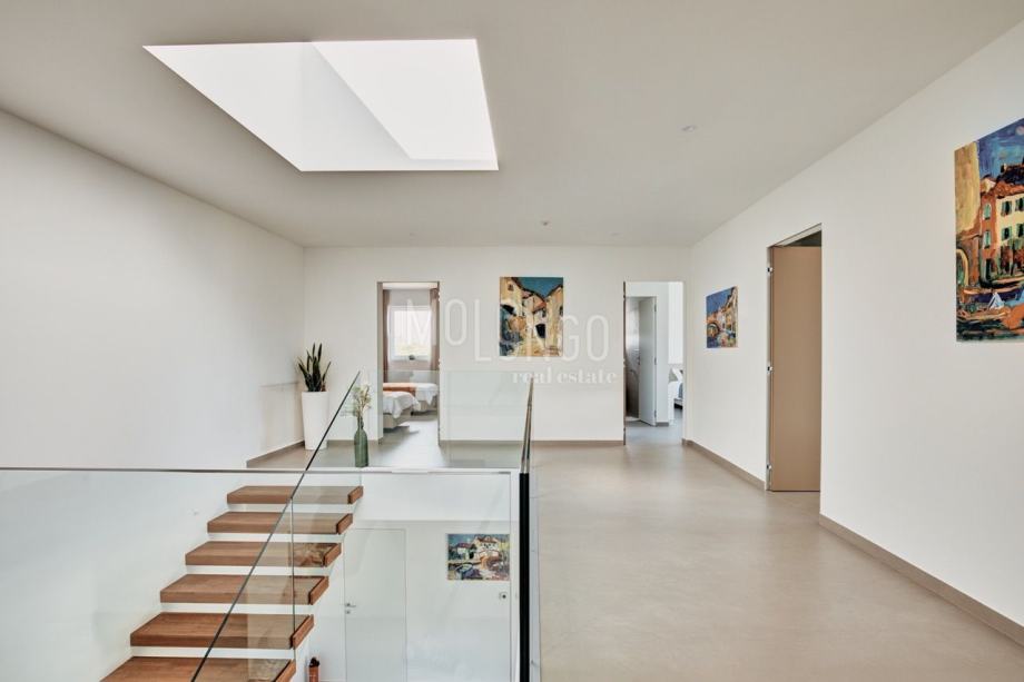 Do spavaćeg dijela kuće dolazi se modernim stubama sa drvenim gazištem. Svaka od 4 spavaće sobe ima svoju kupaonu. Uz spavaće sobe, na katu je veliki vešeraj.