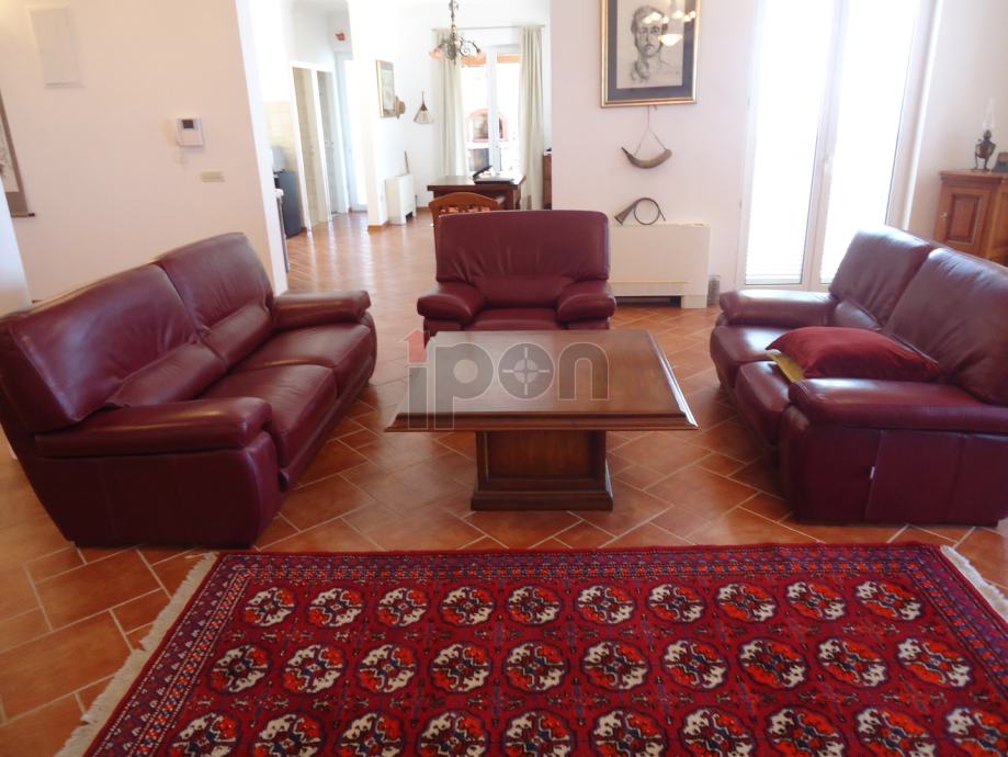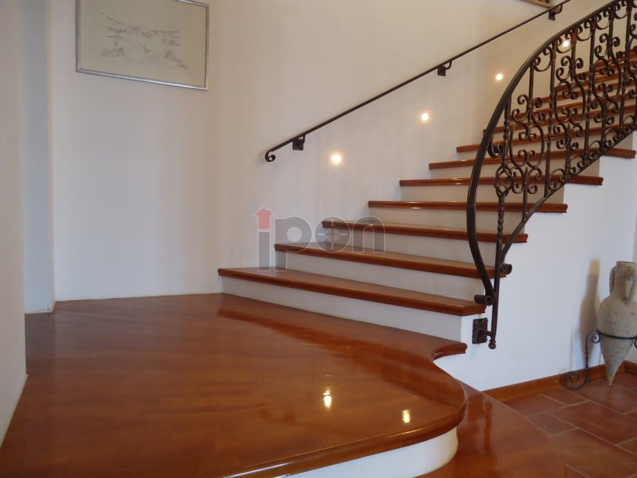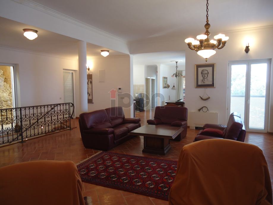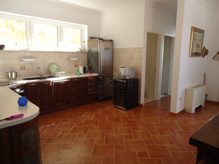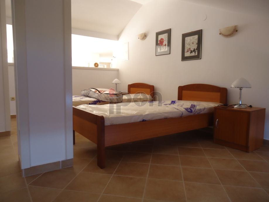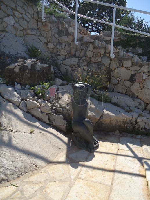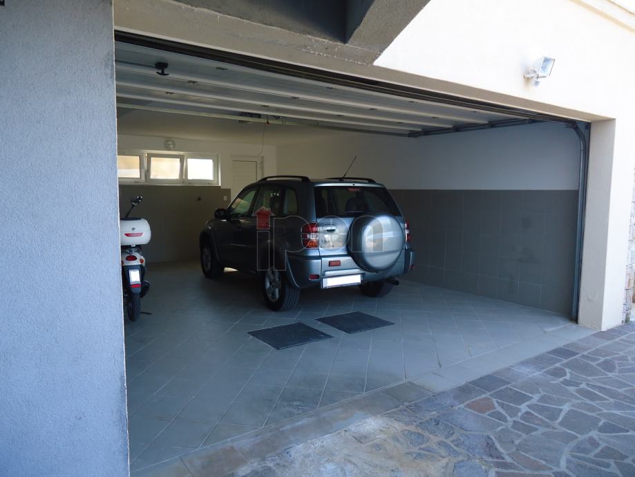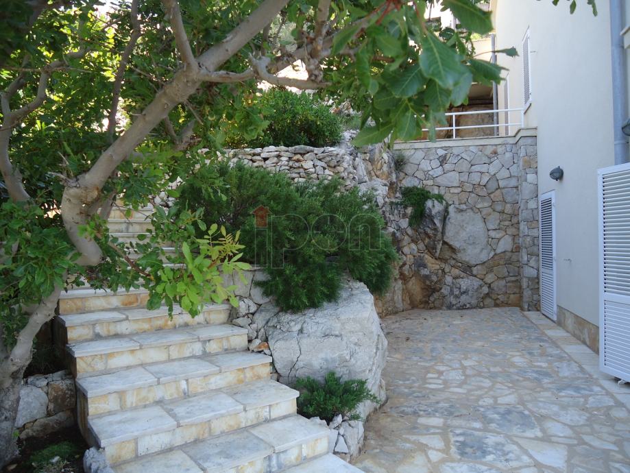Na prvom katu je predivan, veliki i otmjen dnevni boravak sa kaminom, veliki natkriveni balkon, soba, kupaonica( sa svojom terasicom), kuhinja sa blagovaonicom, spremište i još jedan manji wc. Površina 1 kata je 154m2 uvećano za natkrivenu terasu od 50m2 na kojoj se nalazi kameni sudoper, krušna peć i grill a sve je obloženo tesanim kamenom. U visokom potkrovlju su dva manja stana za goste. Kuća je opremljena video nadzorom, solarnim grijanjem te dizalicom topline za grijanje i hlađenje svih prostorija (podno i fencoleri) sistemom za navodnjavanje te pvc stolarijom sa alkuminijskim griljama. Nov je i krov. Bazen je vrhunski i sa dosta dodatne opreme. Okućnica je brižno uređena i njegovana a posađene su uglavnom mediteranske biljke. Za parking je osigurana veća garaža za 2 auta i mogućnost parkinga za još 2 u natkrivenom dijelu kuće.