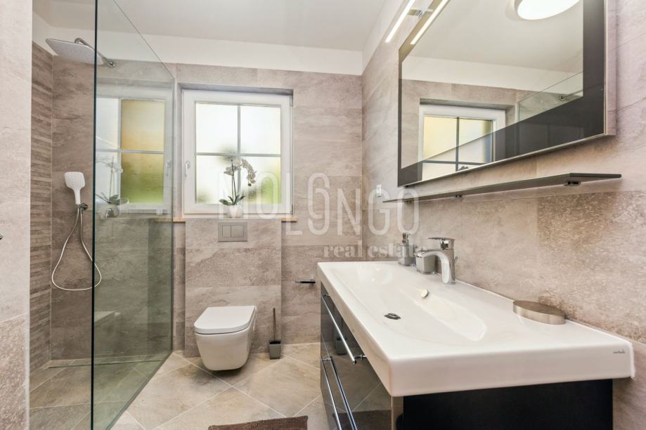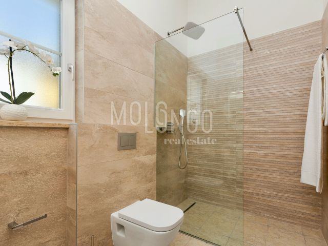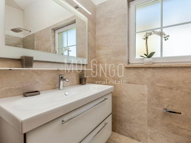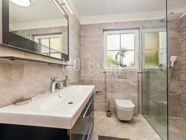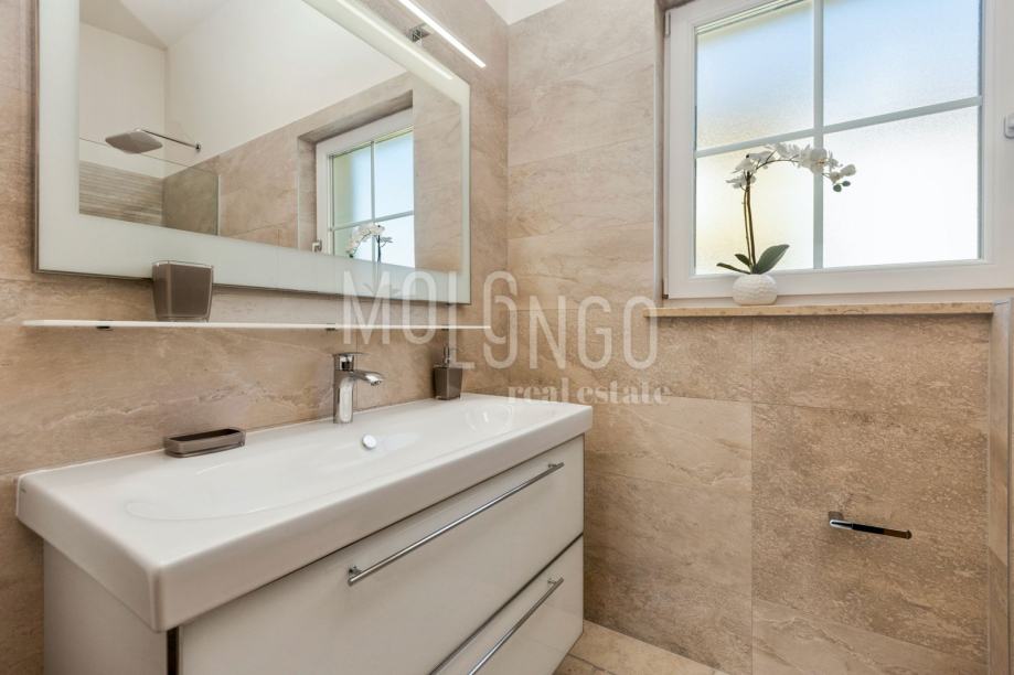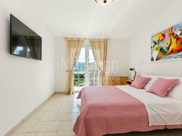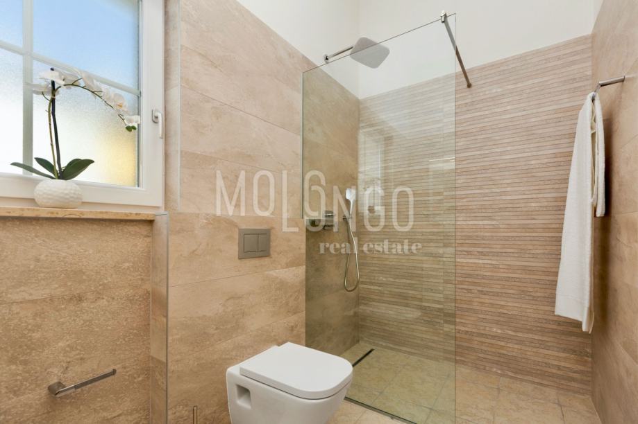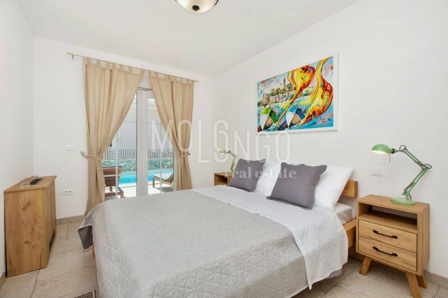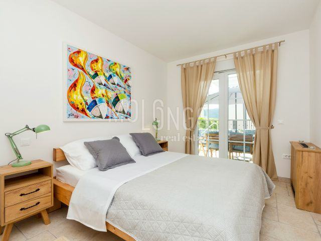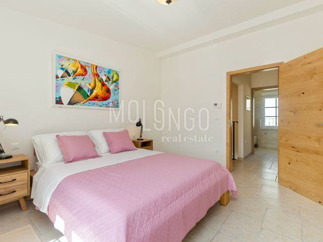 Kamenim stubištem s elegantnom kovanom ogradom dolazi se na kat, gdje se nalaze dvije dodatne spavaće sobe, dvije kupaonice i zajednički balkon s kojeg se pruža pogled na more udaljeno samo 10 minuta hoda.