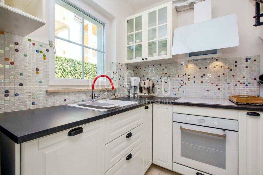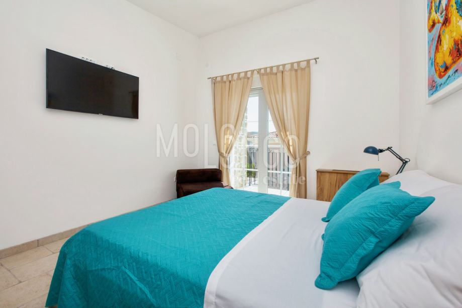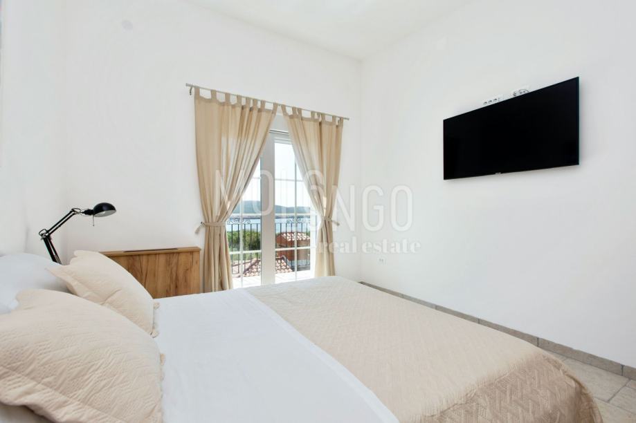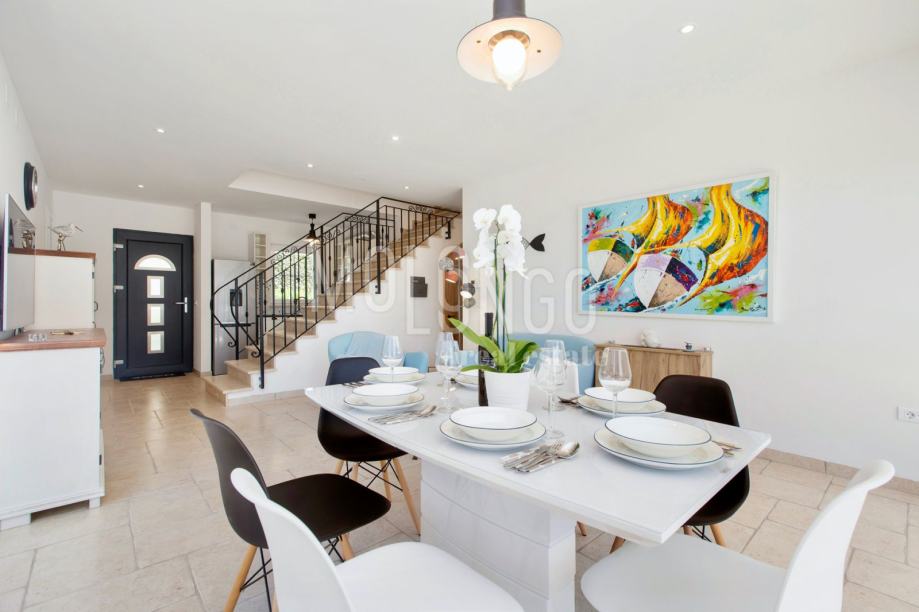 U prizemlju od gotovo 56 metara kvadratnih prevladava središnji otvoreni prostor koji dijeli funkciju dnevnog boravka, kuhinje i blagovaonice iz koje se izlazi na vanjsku, djelomično natkrivenu, terasu s bazenom. Vanjski prostor nudi savršeno mjesto za dijeljenje dragocjenih trenutaka s obitelji i prijateljima uz sunčalište, bazen i roštilj. U prizemlju se još nalazi jedna spavaća soba te kupaonica. Unutrašnje stubište izrađeno od kamena s kovanom ogradom vodi na prvi kat gdje se na dodatnih 55 metara kvadratnih prostiru još dvije kupaonice te dvije spavaće sobe sa zajedničkim balkonom s kojeg se pruža pogled na more koje se nalazi svega dvanaest minuta hoda od kuće.