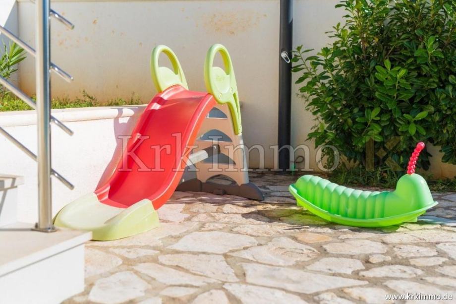 Okućnica je uređena i oplemenjena mediteranskim biljem, a uključuje bazen od 24 m2 s prostranim sunčalištem, igralište za djecu, vanjski zidani kamin i vanjski tuš. Na raspolaganju su i tri parkirna mjesta.