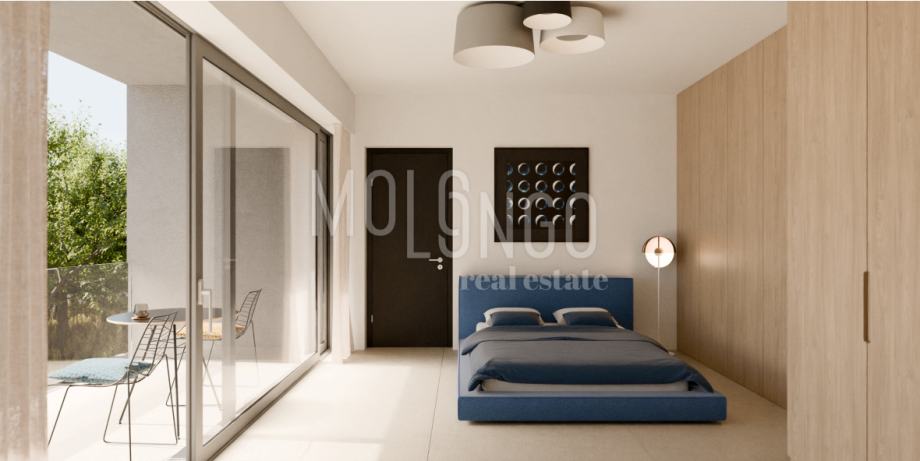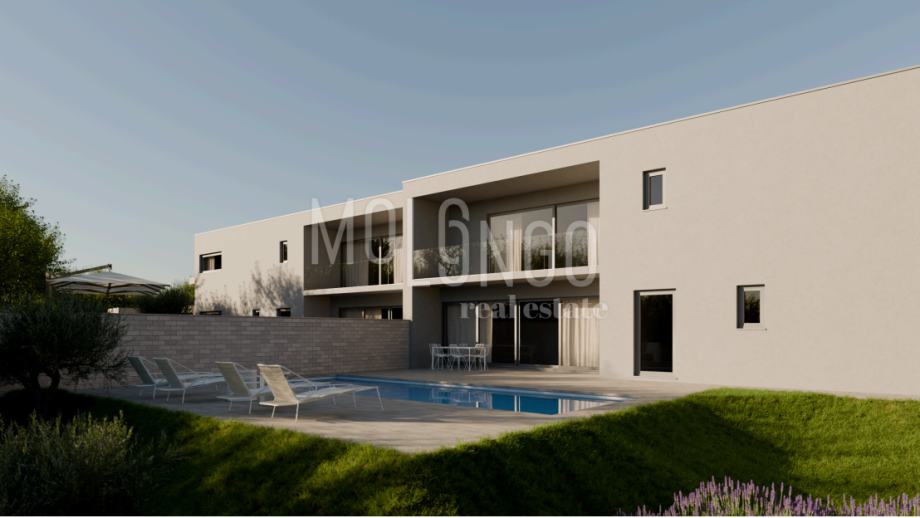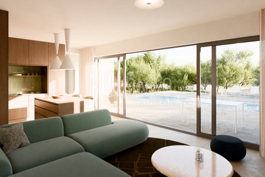 Villa s bazenom i pogledom na more.Ova moderna novogradnja nalazi se 800m od mora.Radi se o dvojnom objektu s vlastitim bazenom,okućnicom i parkingom za dva automobila.Sastoji se od prizemlja u kojem je prostrani dnevni boravak i kuhinja,jedna spavaća soba i kupaonica,zasebno toalet,sauna tuš i utility room.Terasa i bazen.