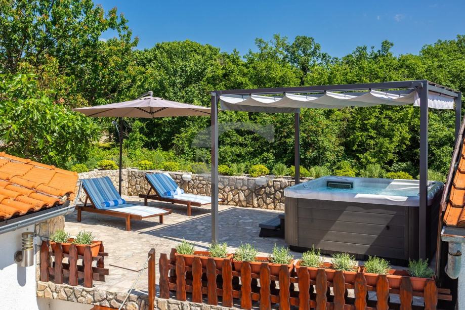 Kuća nudi uređenu konobu za druženje, bazen, vanjski jacuzzi i sunčalište.