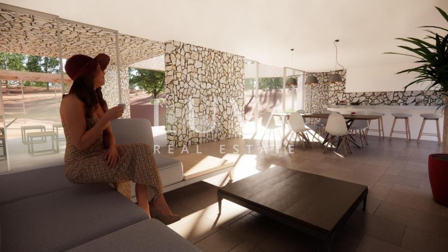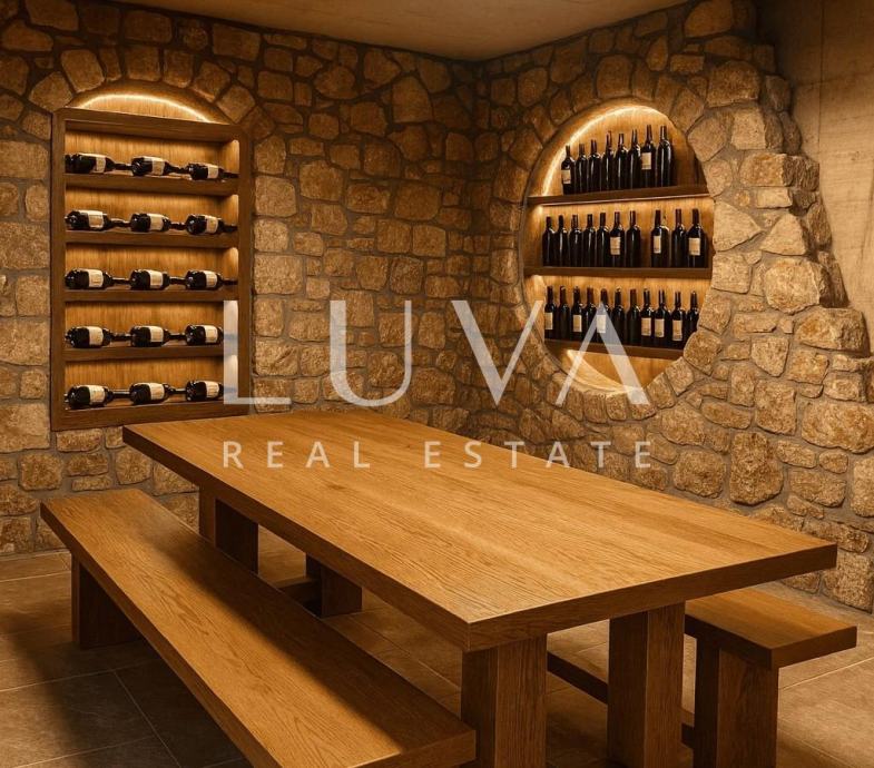 U prizemlju se nalazi impozantan dnevni boravak otvorenog tipa koji objedinjuje kuhinju, blagovaonicu i prostor za odmor, stvarajući središte doma idealno za druženje i uživanje. Tu su i vinski podrum, kupaonica, dodatni WC, kao i wellness zona sa saunom, iz koje se izravno izlazi prema bazenom i sunčalištu.