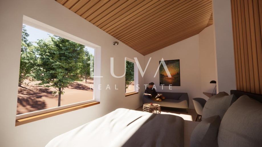 Na katu se nalazi četiri prostrane spavaće sobe, svaka s vlastitom kupaonicom, što jamči maksimalnu udobnost i privatnost. Jedna od soba ima i dodatnu dječju sobu, idealnu za obitelji s djecom. Kat također uključuje balkon s pogledom na prirodu i garažu koja osigurava praktičnost i sigurnost.