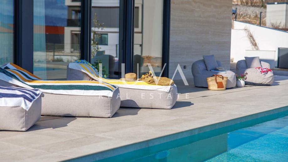 Na terasi se nalazi potpuno opremljena vanjska kuhinja, prostor za blagovanje, sunčalište te infinity bazen, stvarajući idealno mjesto za opuštanje, druženje i uživanje u pogledu na more.