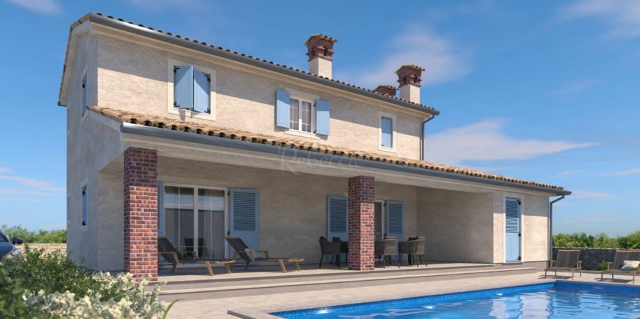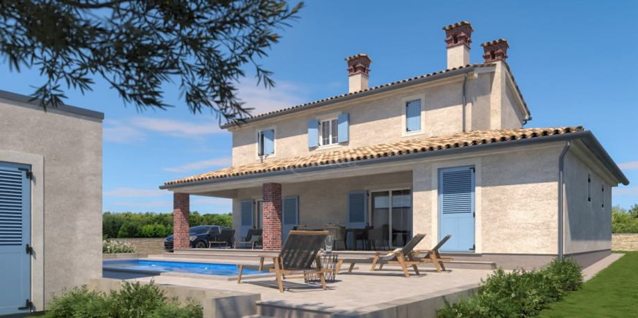 Plan kuće je u istarskom stilu i sastoji se od dnevnog boravka, kuhinje, blagovaonice, tri spavaće sobe, tri kupaonice, spremišta i natkrivene terase.