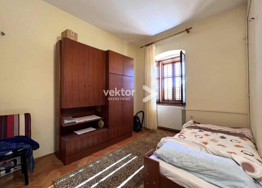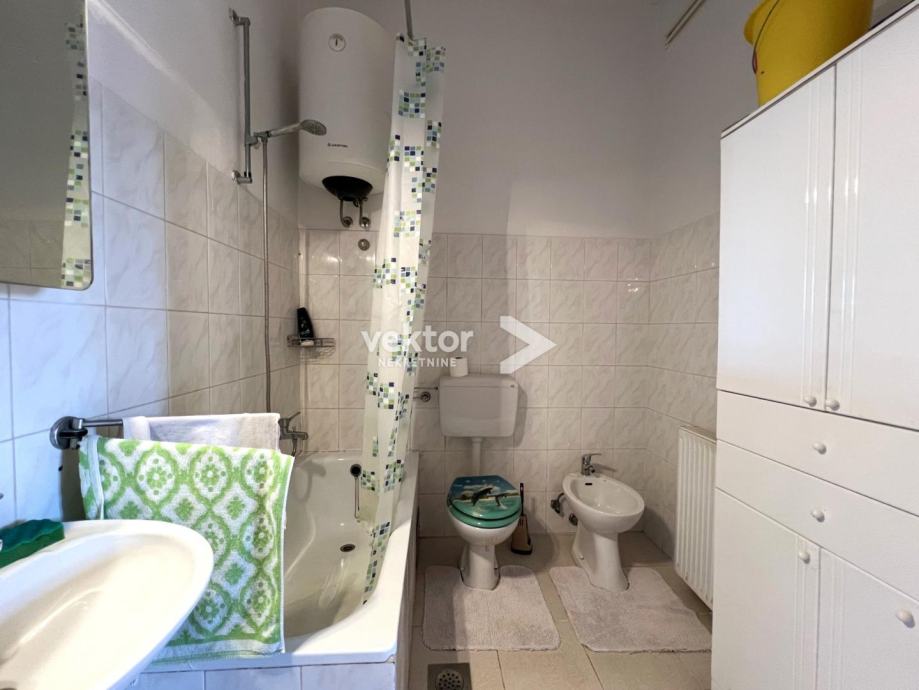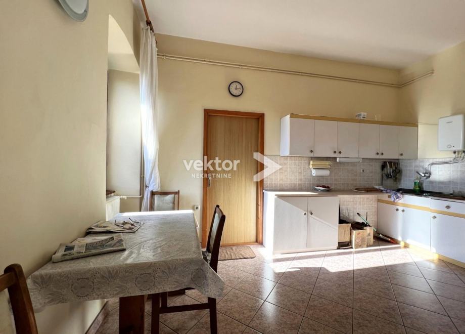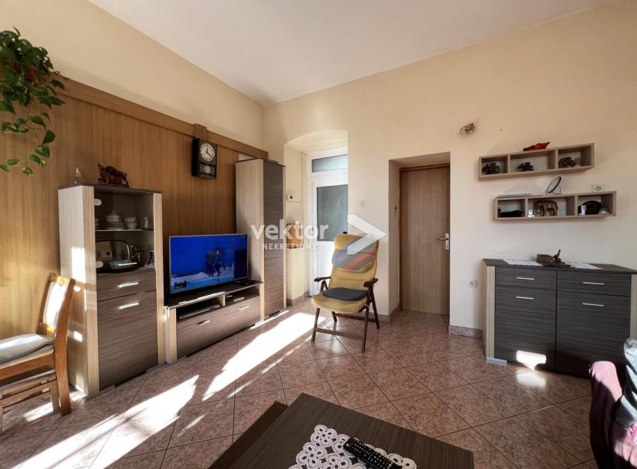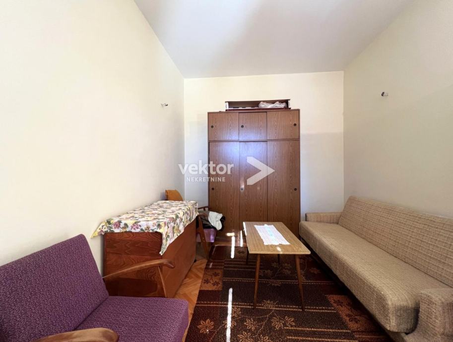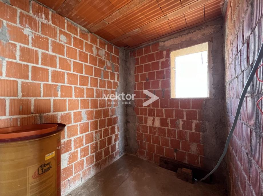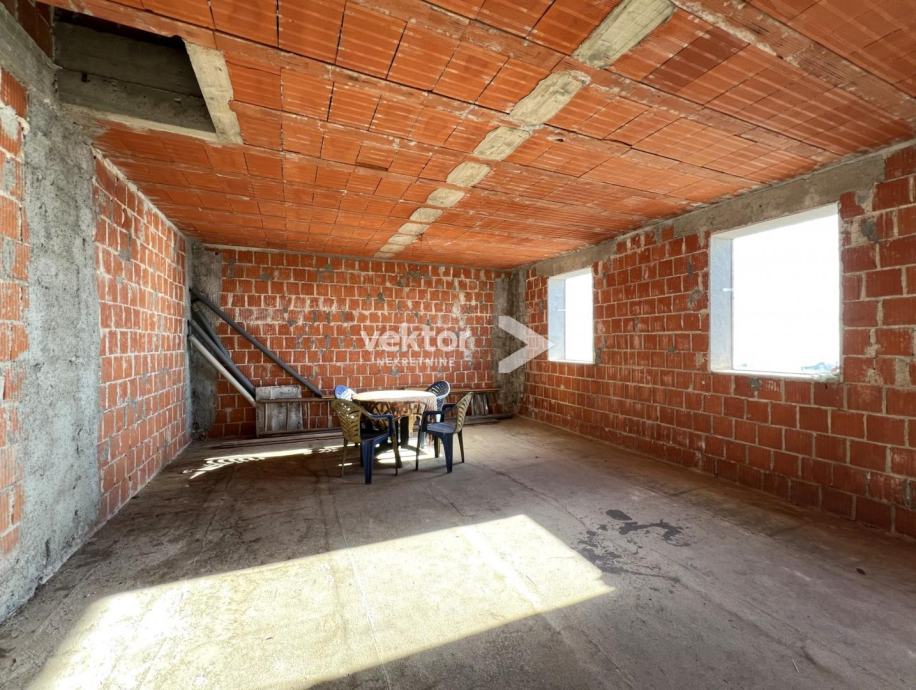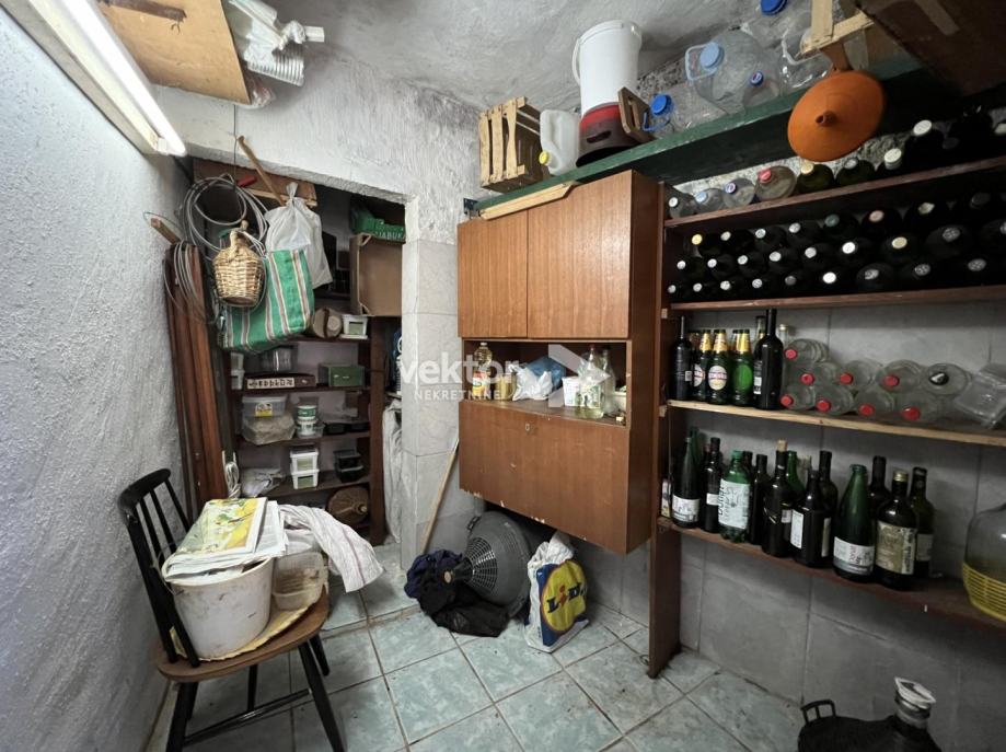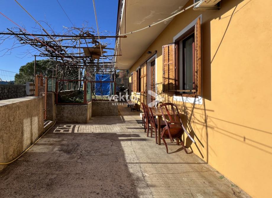 Samostojeća kuća koja ima dvije odvojene jedinice i okružena je sa 280m2 okućnice. Prizemlje je uređen stan koji se sastoji od ulaza, dnevnog boravka povezanog sa kuhinjom i blagovaonicom, dvije spavaće sobe i kupaonice, ukupno 88m2. Na katu se nalazi tlocrtom identičan stan s velikim balkonom i prekrasnim pogledom na more.