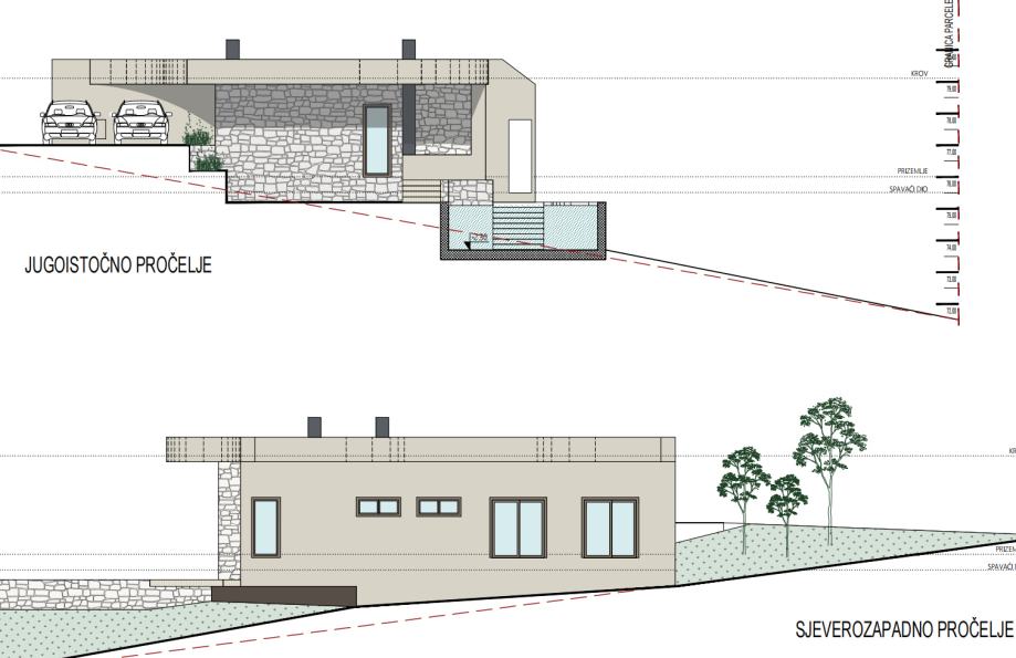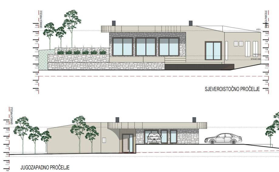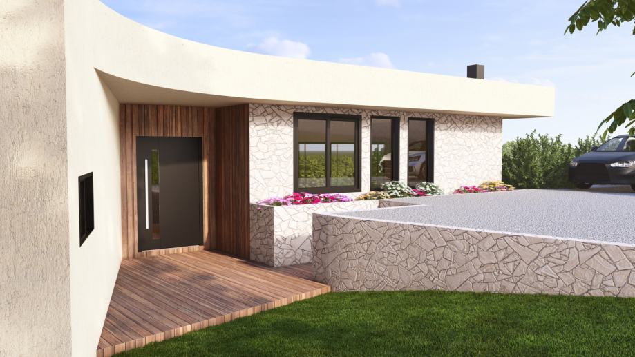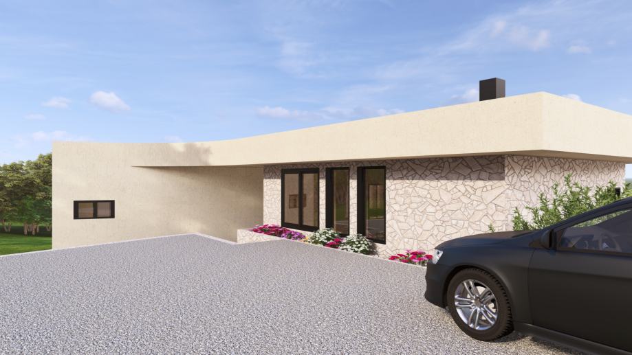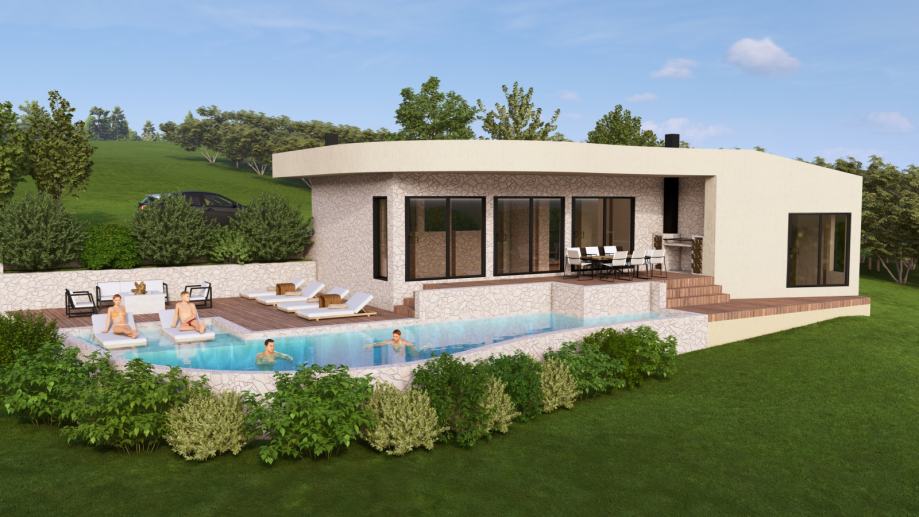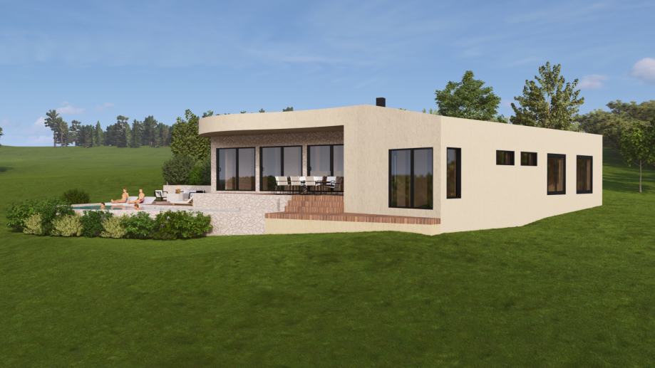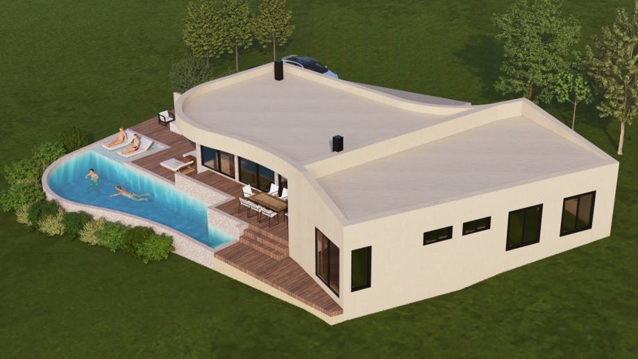 Napravljeno je idejno rješenje za izgradnju prizemne kuće s bazenom.