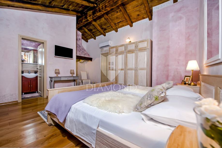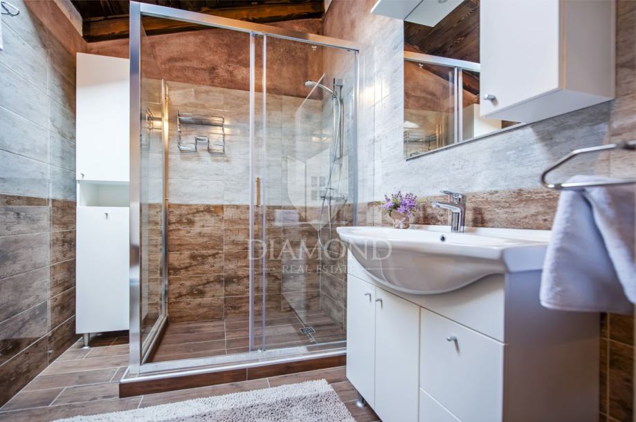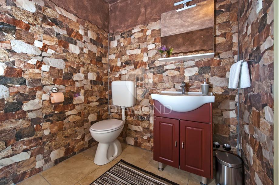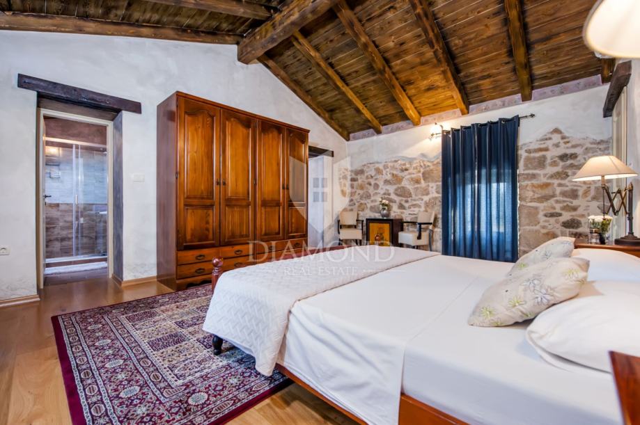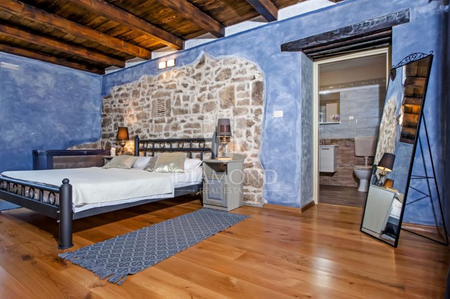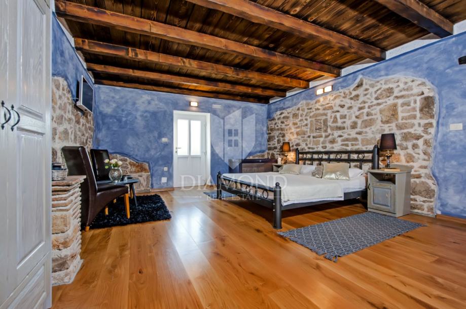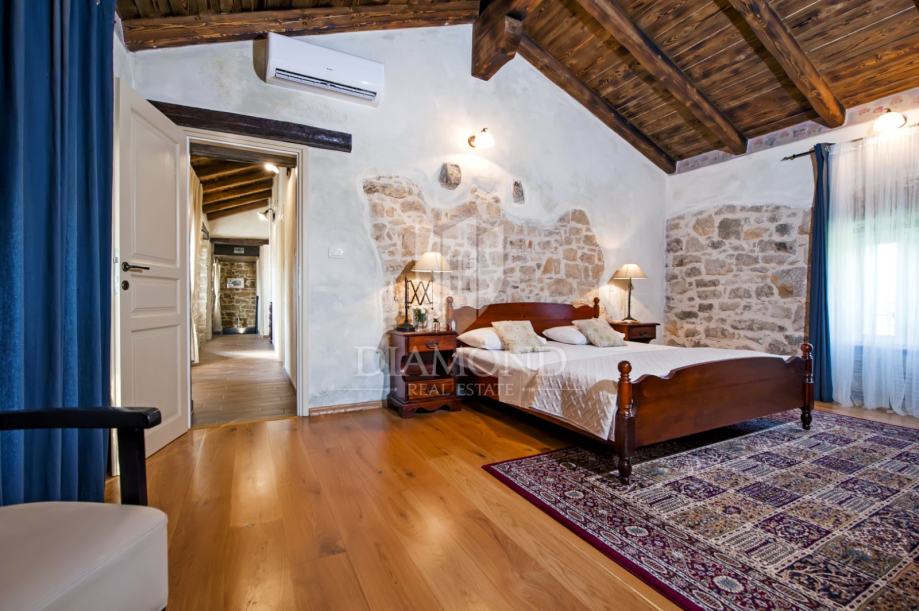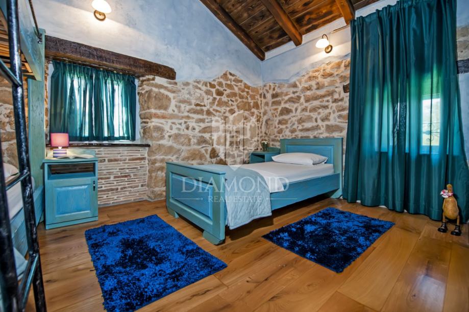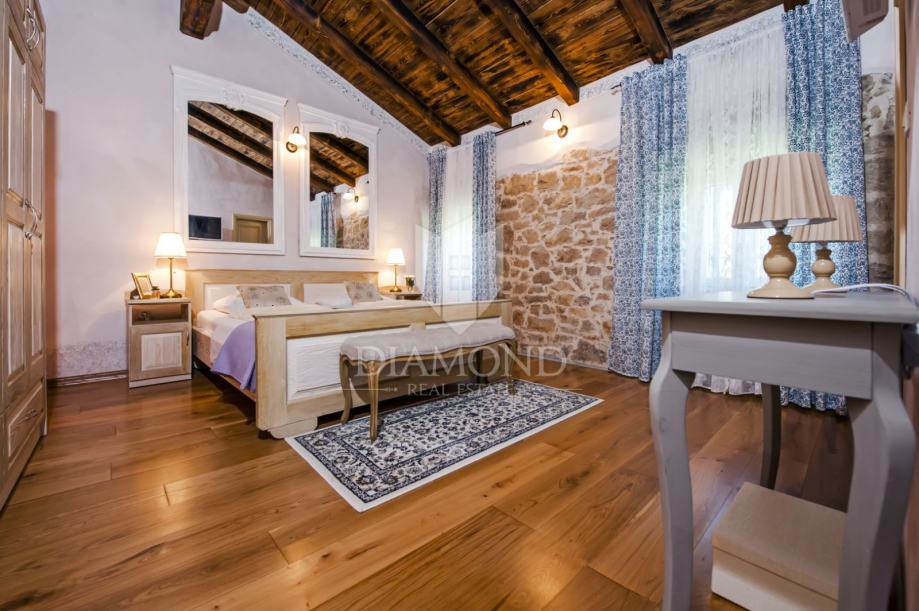 Villa je ukupne površine 183 m2 stambenog dijela koji se prostire na prizemlje i kat. Prizemlje se sastoji od udobnog dnevnog boravka, u potpunosti opremljene kuhinje te blagovaonice. Tu se nalazi i jedan gostinjski wc i praonica. U nastavku prizemlja, sa zasebnim ulazom, nalazi se još jedna spavaća soba sa kupaonicom. Na katu se nalaze tri komforne spavaće sobe, svaka sa svojom kupaonicom. Pitanje grijanja i hlađenja riješeno je lijepim kaminom koji se nalazi u dnevnom prostoru, te klima uređajima koji su postavljeni u svim spavaćim sobama. Dizajn interijera u svim prostorijama savršeno upotpunjuje autohtoni duh ove prekrasne nekretnine i stvara idealnu atmosferu za savršen odmor ili luksuzan obiteljski život.