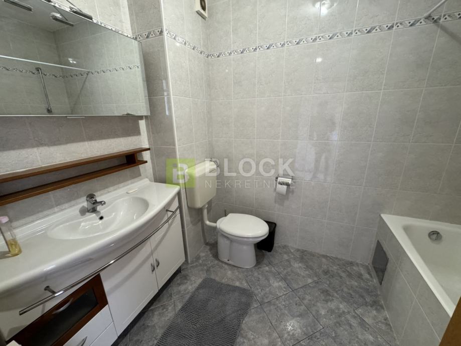 Sastoji se od ulaznog prostora, kuhinje s blagovaonom, prostranog i svijetlog dnevnog boravka s izlazom na balkon i bibliotekom odvojenim radnim dijelom koji ispada kao poluodvojena manja soba, dvije spavaće sobe od koje jedna ima izlaz na drugi balkon, kupaonice s kadom te odvojenog wc-a za goste.