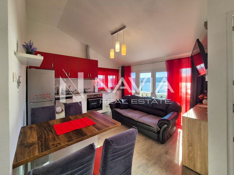 Stan ima prostranu terasu s lijepim pogledom na more, a pogled na more vidljiv je i iz samog stana.