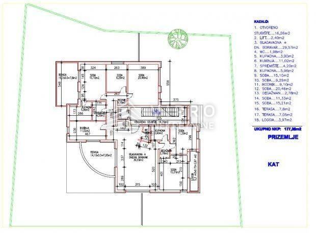 Tlocrtno se sastoji od ulaznog prostora, 5 soba, kuhinje s blagovaonicom i dnevnim boravkom, 2 kupaonice, wc-a, spremišta, natkrivene terase (12 m2) i 2 loggie (14,50 i 6 m2).