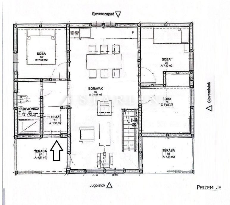 Prizemlje se sastoji od open space dnevnog boravka i kuhinje s blagovaonicom, tri spavaće sobe, kupaonice, hodnika, natkrivene terase i natkrivenog ulaza.