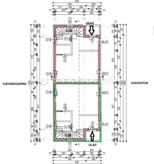 Prodaje se kuća površine 87 m2 koja se proteže na dvije etaže. Projekt je napravljen kao dvojna kuća te se nalazi na Martin Bregu. Dvojne kuće se nalaze na parceli površine 400 m2 i sa zelenom površinom od dodatnih 633 m2 (za svaku nekretninu po 316 m2 zelene površine).