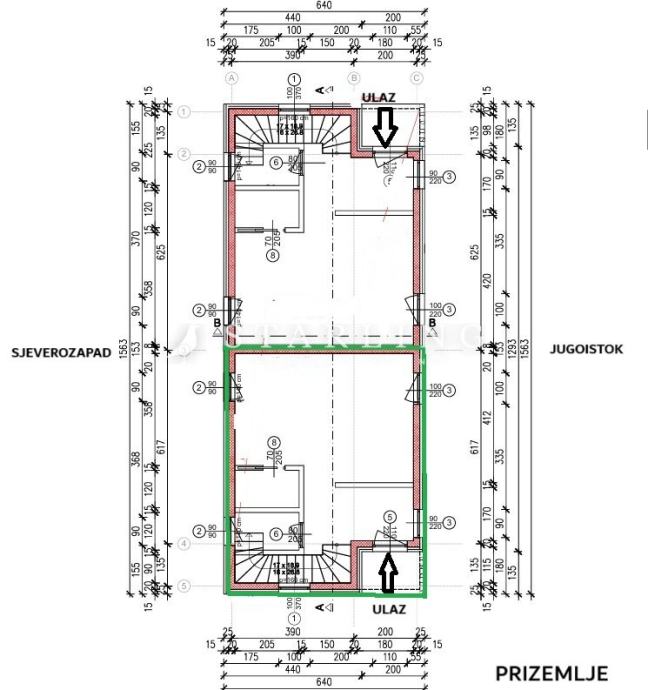 - PRIZEMLJA: hodnik, stubište, wc, ostava, dnevni boravak s kuhinjom i blagovaonicom