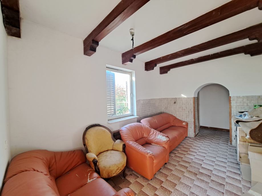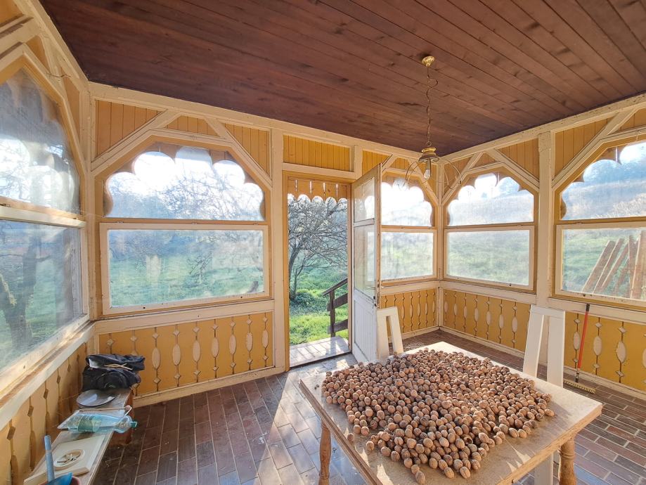 Pored verande tu su još i kuhinja s blagovaonicom, dnevni boravak, kupaonica te soba. Kuća također ima i dva podruma te tavan, a moguće je i proširenje postojećeg stambenog prostora.
