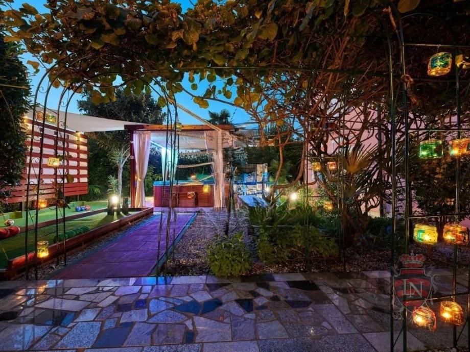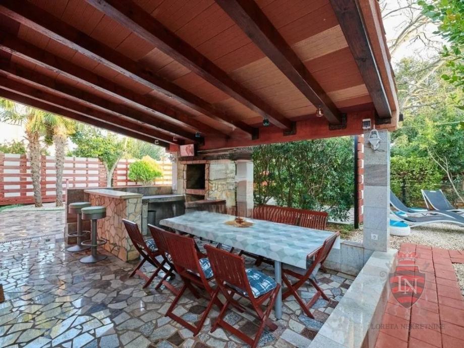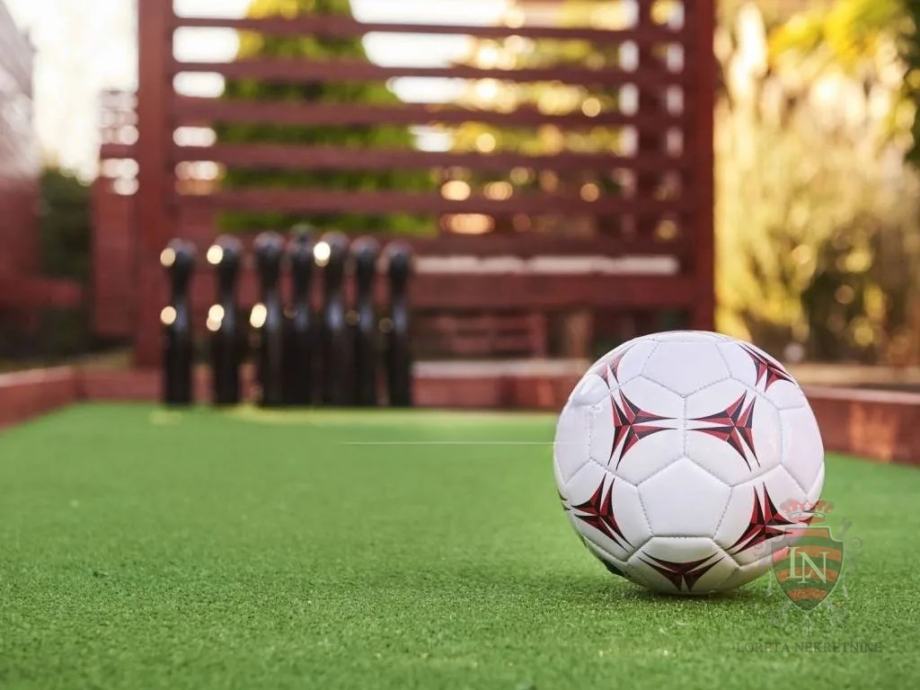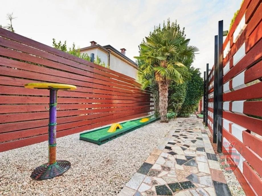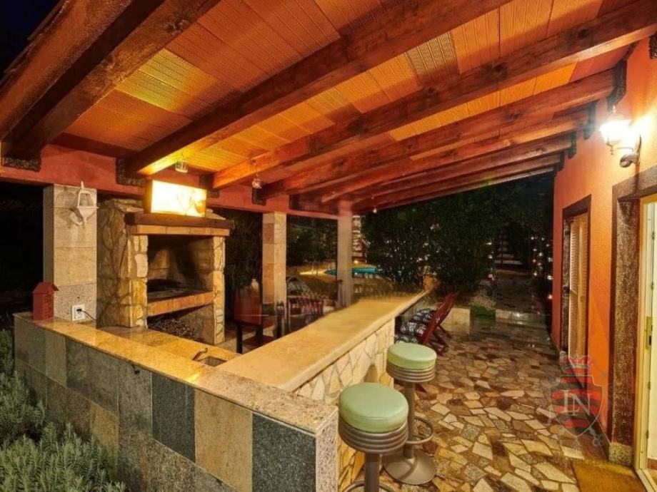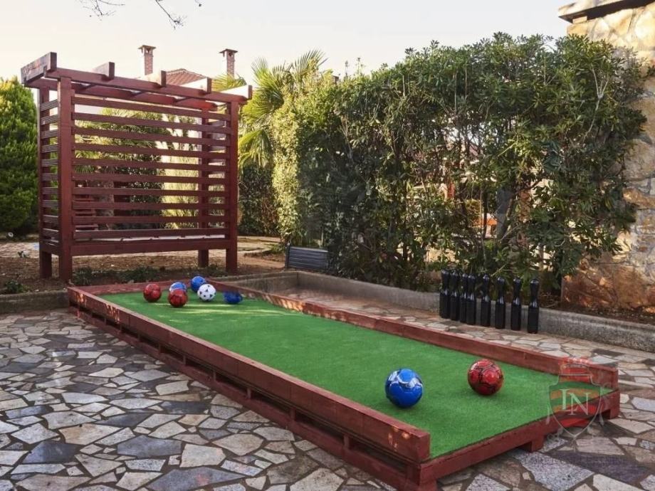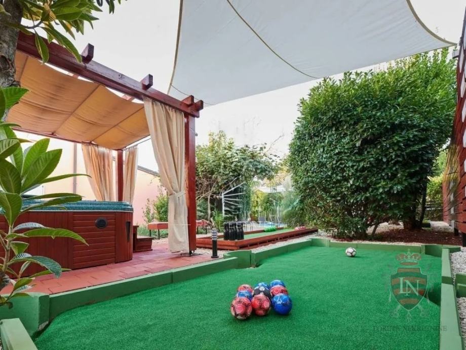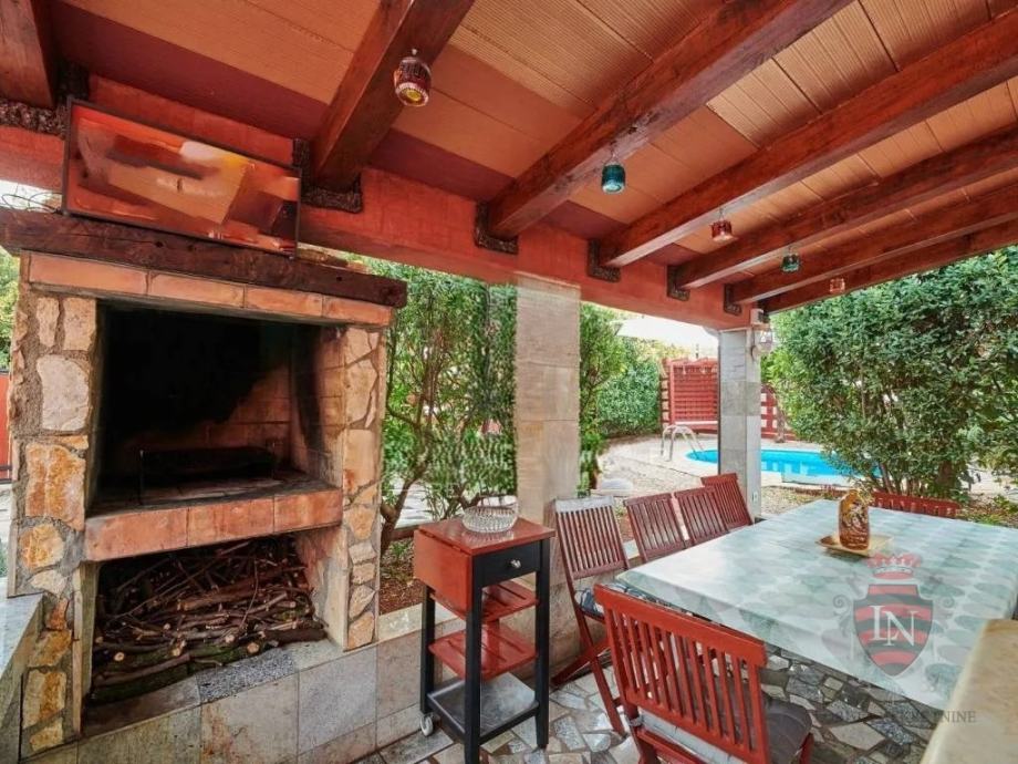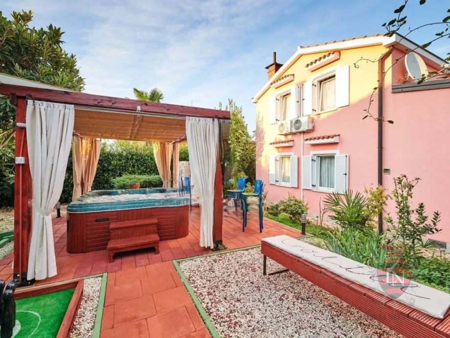 Vanjski prostor idealan je za opuštanje i zabavu, s terasom, roštiljem, bazenom, jacuzzijem i prostorima za razne sportske aktivnosti. Nekretnina ima parking za tri vozila, visoku živicu i drvenu ogradu koja osigurava maksimalnu privatnost. Opremljena je s četiri klima uređaja, kaminom i alarmnim sustavom s kamerama. Prodaje se potpuno namještena, što je čini idealnim rješenjem za useljenje ili investiciju u turizam.