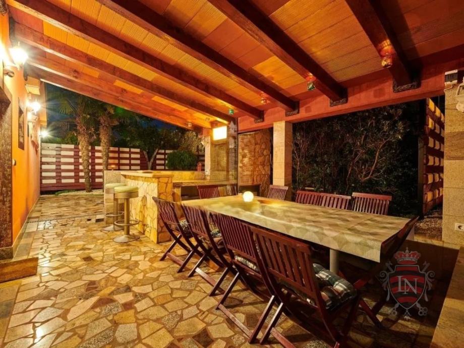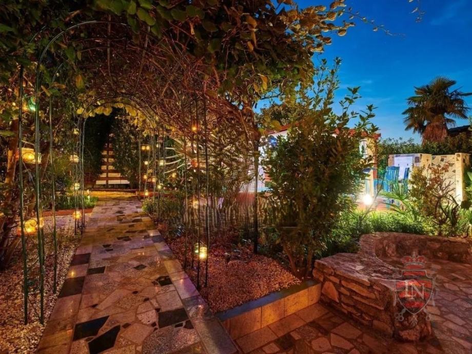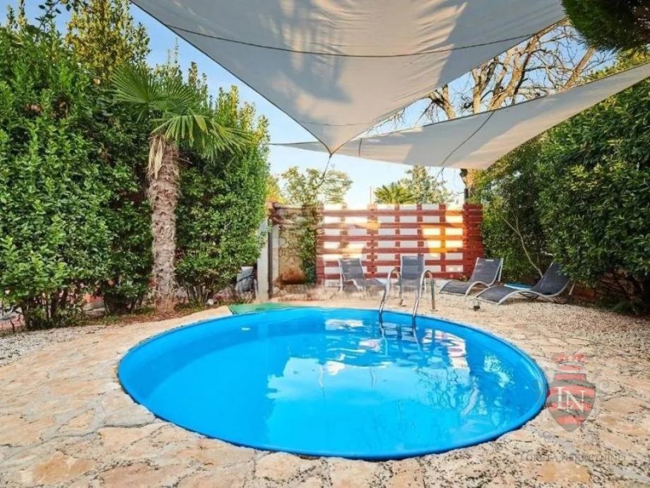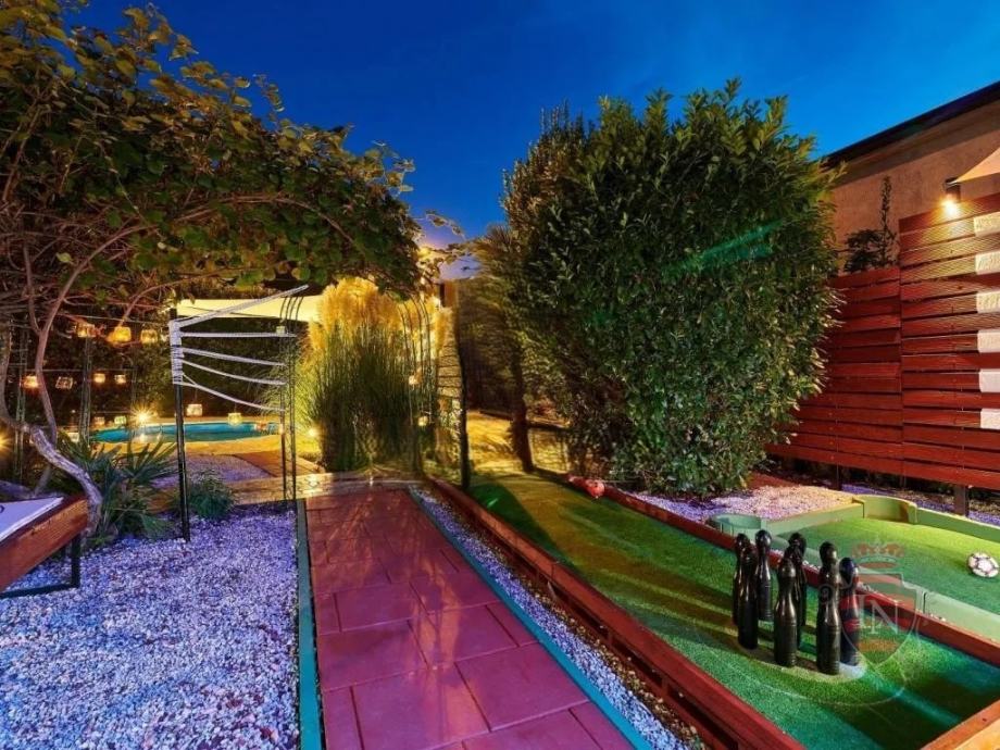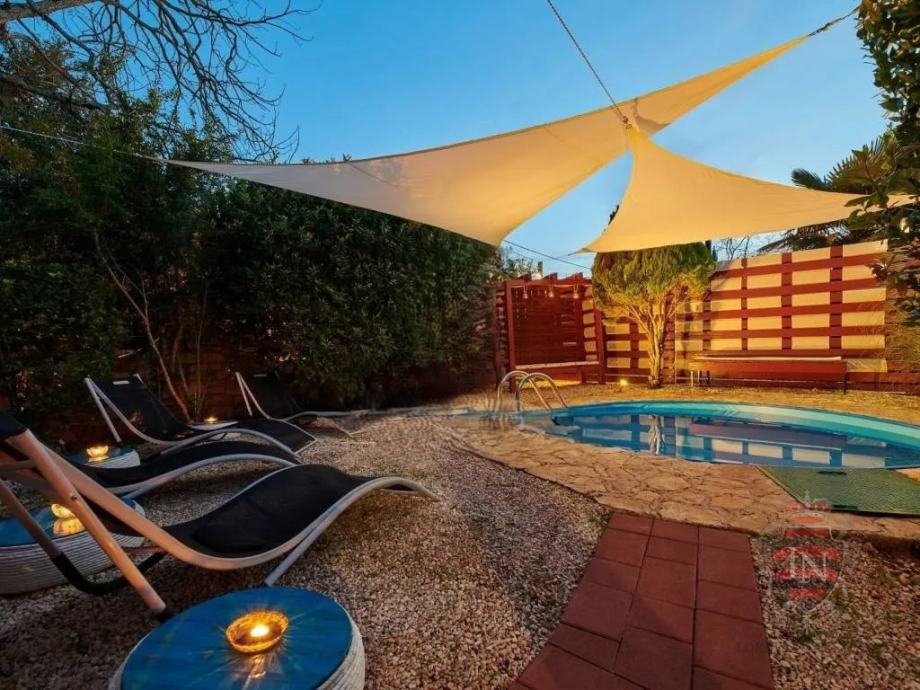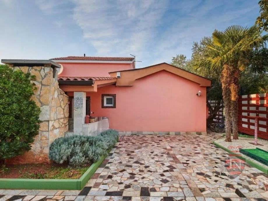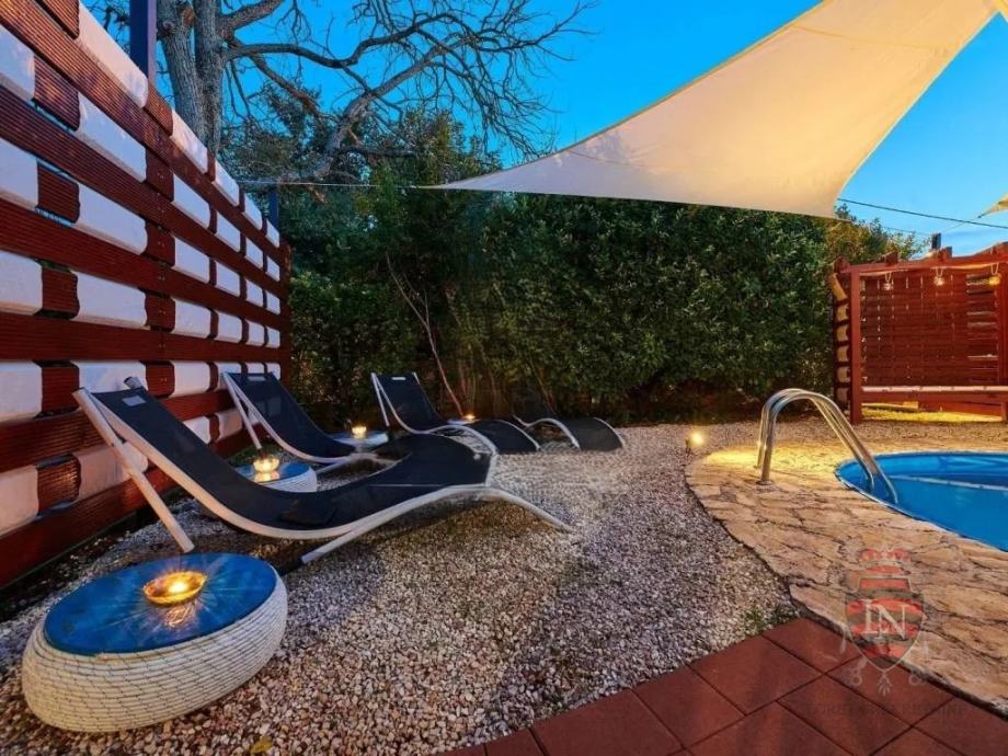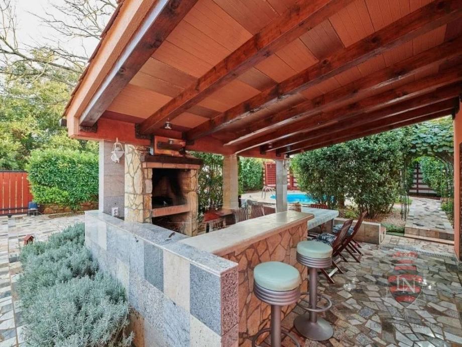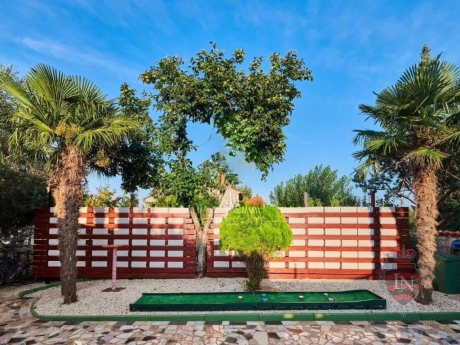 Vanjski prostor idealan je za opuštanje i zabavu, s terasom, roštiljem, bazenom, jacuzzijem i prostorima za razne sportske aktivnosti. Nekretnina ima parking za tri vozila, visoku živicu i drvenu ogradu koja osigurava maksimalnu privatnost. Opremljena je s četiri klima uređaja, kaminom i alarmnim sustavom s kamerama. Prodaje se potpuno namještena, što je čini idealnim rješenjem za useljenje ili investiciju u turizam.