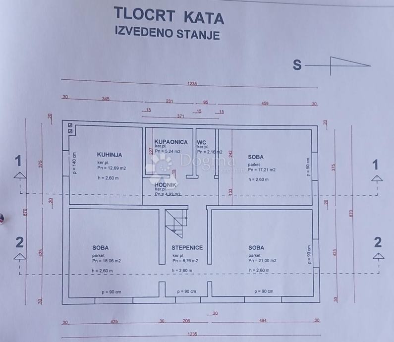 1. kat (107,5 m²): 3 sobe, kuhinja, kupaonica s WC-om i ostava